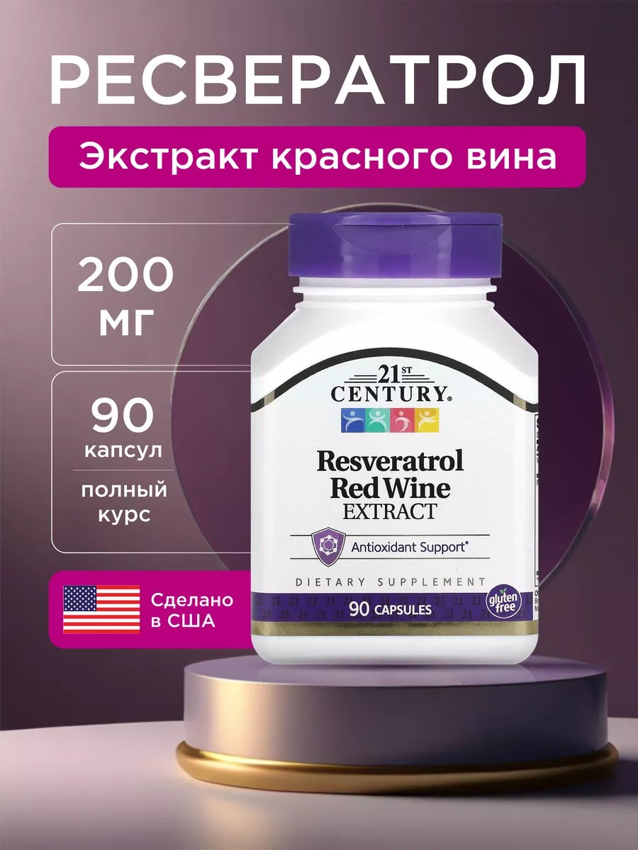 Resveratrol Red Wine Extract от компании 21st Century - это экстракт красного вина и ресвератрол бад, который разработан для поддержки антиоксидантного здоровья, борясь с воздействием свободных радикалов. Также этот препарат содержит витамин С, цитрусовые биофлавоноиды (из апельсина), полифенолы винограда, экстракты виноградных косточек, граната, корень горца японского. Экстракт красного вина содержит полифенолы, биофлавоноиды (кверцетин, рутин), антоцианы, катехины, проантоцианидины, микро- и макроэлементы, незаменимые аминокислоты, витамины группы В. Ресвератрол уменьшает риск развития инсульта и инфаркта, снижает уровень холестерина, а также поддерживает упругость и эластичность кожи, стимулируя синтез коллагеновых волокон и предотвращая ее преждевременное старение. Полифенолы являются антиоксидантами, а также борются с атеросклерозом, диабетом, опухолями, ишемической болезнью сердца, неврологическими заболеваниями, астмой, вирусами. Горец гребенчатый и кожица винограда являются уникальной молекулой-антиоксиданта, стимулирующей активность генов долголетия.