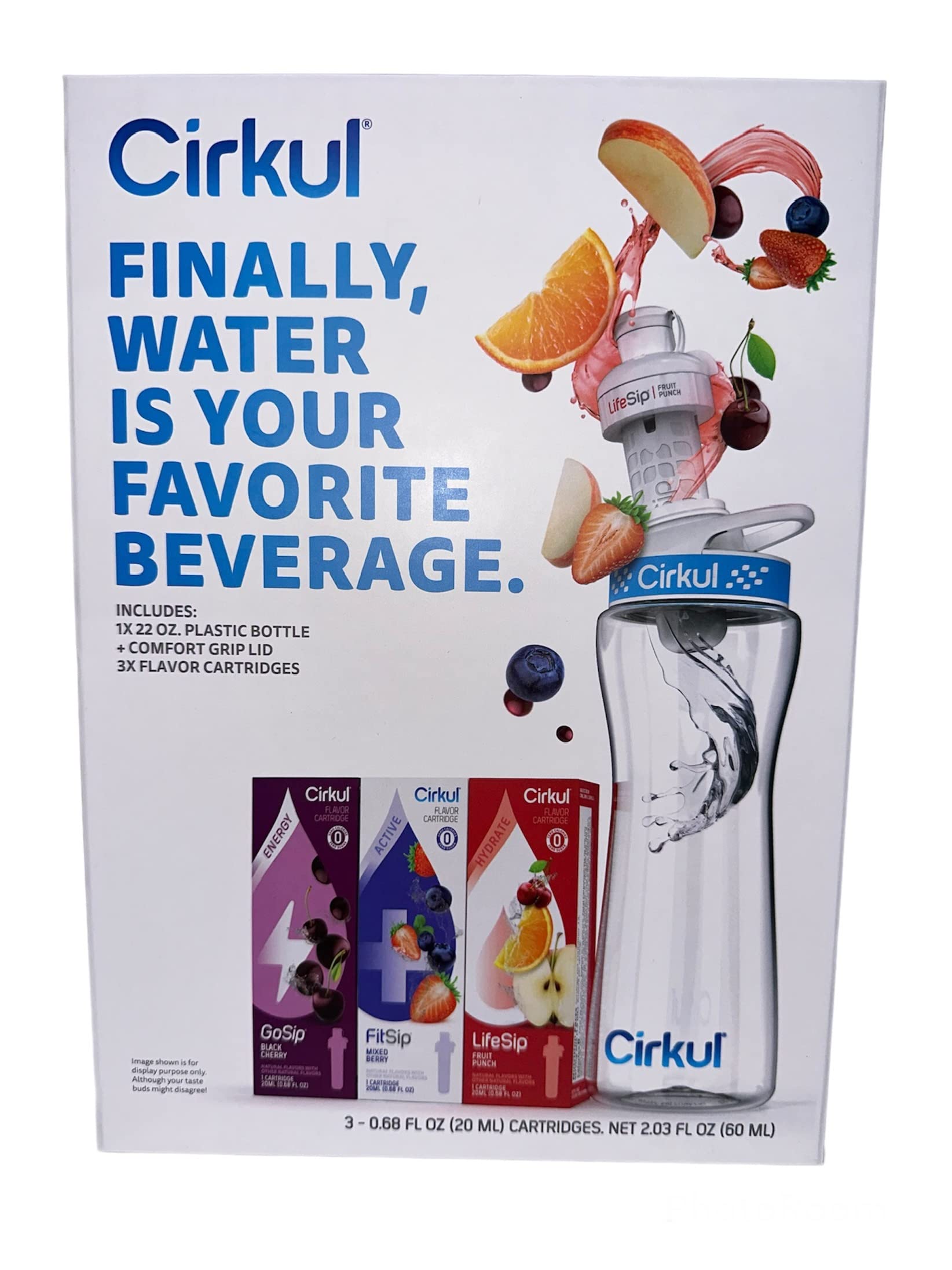 Includes: 1x 22 oz. Plastic bottle comfort grip lid 3x flavor cartridges. GoSip Black Cherry. Caffeine content: 30mg 1.5ml. Finally, water is your favorite beverage. LifeSip Fruit Punch: Fruit Punch is a classic. A little citrus. A little sweetness. It's like the classic rock of flavors the perfect blend of fruity notes that just works. FitSip Mixed Berry: Whether it's game day or leg day, our Mixed Berry flavor has the electrolytes you need to help push through your most rigorous workouts. Burpees don't stand a chance. GoSip Black Cherry: Give your taste buds a wake-up call. Our energy-enhanced Black Cherry flavor will keep you hydrated and caffeinated so you can stay focused. And awake. Your water your way. Customizable flavor dial. Cirkul's patented flavor dial allows you to adjust up or down the amount of flavor each time you take a sip! 1 cartridge six 20 oz. bottle fill-ups. Each Cirkul cartridge contains enough flavor to create the equivalent of six 20 oz. standard beverages. It's like a 6-pack of your favorite drink in your pocket! Always a clean bottle. Cirkul's patented flavor cartridge technology makes sure that your delicious flavor never mixes inside the bottle itself, keeping the bottle clean. Better for the environment. 84 Reduction in plastic. One Cirkul Sip contains about the same amount of plastic as a standard 20 oz. bottled beverage. Since each Cirkul Sip on average allows you to fill your bottle six times, you're saving five plastic bottles from waste each time you enjoy a Cirkul Sip! 96 less shipping weight. One Cirkul Sip contains the equivalent to almost 9 pounds of bottled beverages. That's because Cirkul's technology removes all of the hard-to-ship water from the beverage equation! Less weight means less shipments on the road and no more lugging heavy cases of beverages from the store! INGREDIENTS LifeSip Fruit Punch: Filtered Water, Natural Flavors, Citric Acid, Lactic Acid, Sucralose, Potassium Bicarbonate, Phosphoric Acid, Niacinamide, Sodium Benzoate (to Preserve Freshness), Potassium Sorbate (to Preserve Freshness), Calcium Pantothenate, Pyridoxine Hydrochloride, Cyanocobalamin (Vitamin B12). FitSip Mixed Berry: Filtered Water, Natural Flavors, Citric Acid, Monopotassium Phosphate, Lactic Acid, Salt, Sodium Citrate, Sucralose, Phosphoric Acid, Niacinamide, Sodium Benzoate (to Preserve Freshness), Potassium Sorbate (to Preserve Freshness), Pyridoxine Hydrochloride, Cyanocobalamin (Vitamin B12). GoSip Black Cherry: Filtered Water, Natural Flavors, Citric Acid, Lactic Acid, Sucralose, Sodium Citrate, Caffeine, Taurine, Phosphoric Acid, Niacinamide, Sodium Benzoate (to Preserve Freshness), Potassium Sorbate (to Preserve Freshness), Pyridoxine Hydrochloride, Panax Ginseng Extract, Guarana Extract, Cyanocobalamin (Vitamin B12).Customizable Flavor Dial, 84 Reduction in Plastic, Always a Clean Bottle, 1 Cartridge 6 20 oz Bottle Fill Ups, Zero Calories, Zero Sugar No Artificial Flavors or Colors. Flavor Dial gives you full control of your delicious flavor. Just turn the dial up or down. Reusable Affordable - Each Flavor Cartridge can flavor the equivalent of six 20oz fully flavored bottled beverages. Zero sugar, zero calories and no artificial flavors or colors. Innovative water bottle and cartridge system that makes drinking water more delicious, fun personalized.