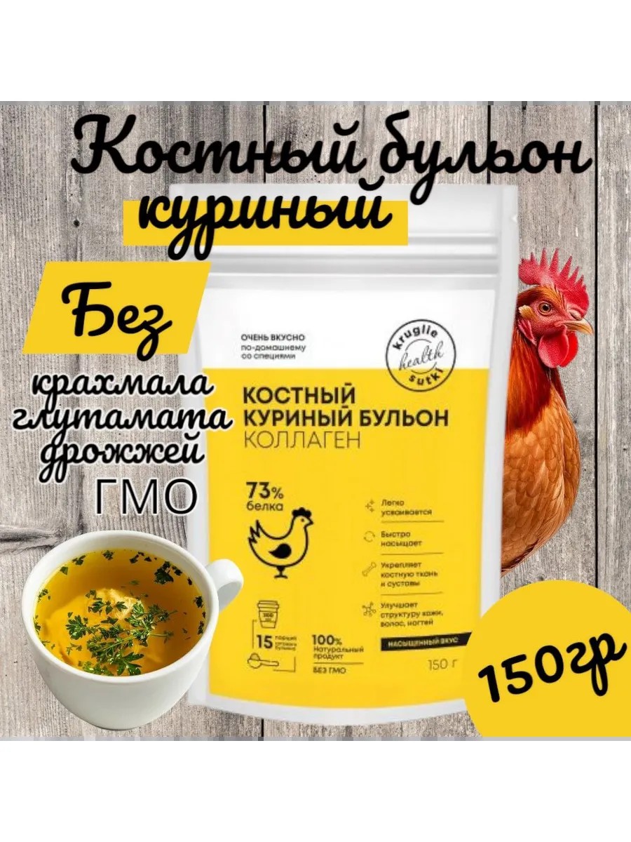 Костный куриный бульон-это концентрированный сухой бульон с большим содержанием коллагена, включает ароматные приправы, среди которых сушеные овощи и зелень, а также соль,которая обеспечивает оптимальное её содержание в блюде. Бульон получается прозрачным, ароматным и насыщенным вкусом. В костном бульоне практически нет углеводов, минимум калорий, что способствует быстрому насыщению и продолжительному чувству сытости. Куриный костный бульон быстрого приготовления- источник важных элементов для оздоровления кишечника, поддержки иммунитета, крепости суставов, улучшения состояния кожи, ногтей и волос. Содержит гидролизованный коллаген тип 2, лучше всего усваивается в натуральной форме, в составе более 20 аминокислот. Является отличным источником белка, строительным материалом для соединительной ткани сухожилий, связок, хрящей, отвечает за их прочность,улучшает подвижность суставов. Бульон может быть самостоятельным блюдом, так и основой для супов или дополнением к другим продуктам. Используйте порошок так же и для приготовления гарнира, чтобы сделать его привлекательным и золотистым.