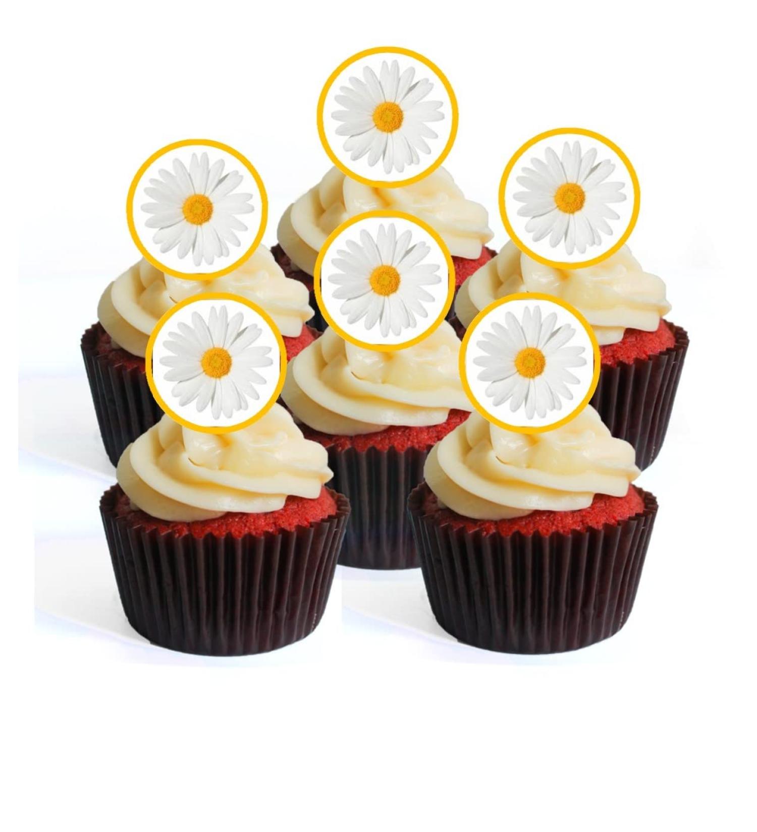 24 Daisy Flower Edible PREMIUM THICKNESS SWEETENED VANILLA Wafer Rice Paper Cupcake Toppers/Decorations UNCUT
