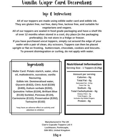 100 Edible. Easy to use: simply cut around the image with a sharp pair of scissors and stand the topper on your iced or butter creamed cupcake. High resolution images, vibrant colours, 4.5cm Size. Gluten free, nut free, dairy free, lactose free, and suitable for vegetarians and vegans. Premium thickness wafer card (not cheap rice paper).