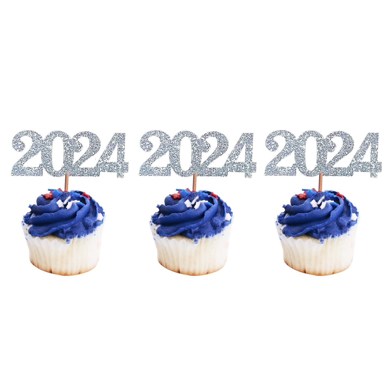 24 Pack 2024 Cupcake Toppers Glitter 2023 Food Cake Picks Decoration for New Year Birthday Wedding Graduation Party Dessert Decoration (Silver)
