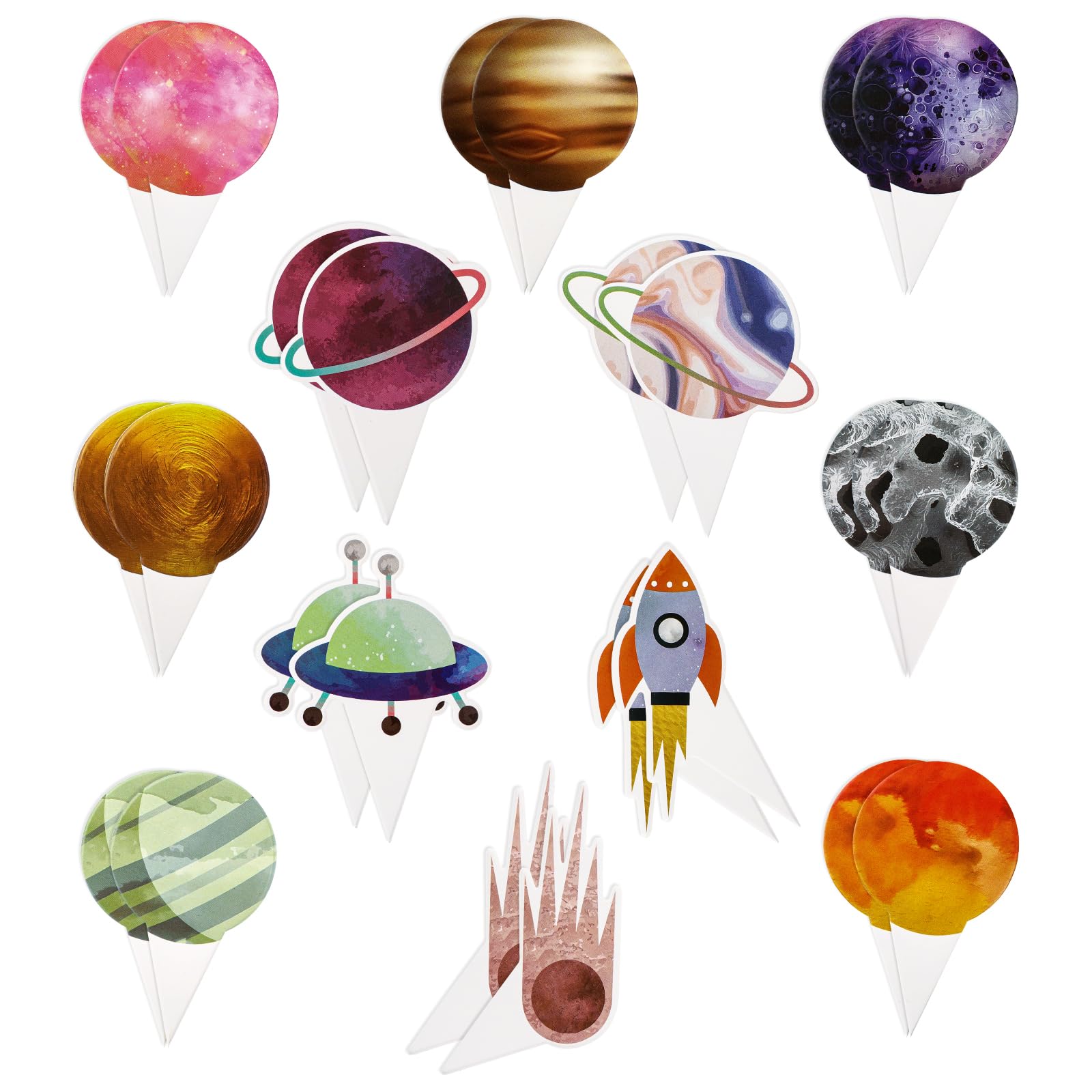 QUALITY SERVICE: If you have any questions or problems about our products, please feel free to contact us, we will give you a satisfactory answer. Wide Application: Planet cupcake picks can be used to decorate cakes, cupcakes, desserts, pastries, fruits, and donuts. Space themed cake toppers make your party cake more attractive and impress your guests. High Quality Material: Space-themed cupcake gift hats are made of paper material, not easily deformed or broken, safe and reliable. Adopting fine printing technology, the pattern is clear and not easy to fade. Space Theme Cake Toppers: You will receive 24 pieces of Space Planet Cake Hats, 12 styles, 2 pieces of each style, enough to satisfy your party needs and daily use, a variety of styles to meet your different preferences!. Outer Space Design: Space-themed birthday cakes decorated with planet and rocket designs make great birthday gifts for kids or outer space enthusiasts!.