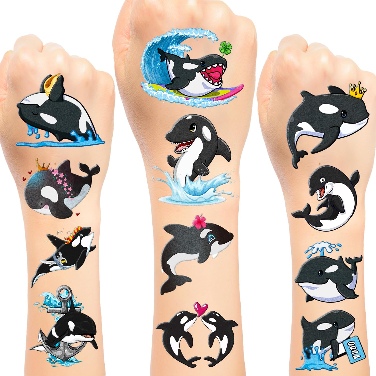 About our products : One tattoos pack contains 24 sheet orca temporary tattoos with 12 various styles. Each of our orca tattoo stickers has a unique design to make your life brighter. How to use : First, cut each tattoo out of sheets and remove the sheet clearly. Second ,you can stick it on hands, face, arms or wherever you feel safe. After that, you wet it thoroughly with water and wait for 20-30 seconds, you get rid of the backing paper, so you can get the tattoo you want. Specification: Size: 8 x 12 cm 3.1 x 4.7 inches Quantity: 24 x orca temporary tattoo?Occasions to Use?Cute orca temporary tattoo stickers are perfect for orca themed party favors, orca party decorations, orca birthday party decorations, Children's Day giveaway, classroom rewards, baby shower, goodie bag fillers, also very attractive for daily use, lovely accessories for orca lovers. ?How to Use?Cut each tattoo out of sheets and remove the sheet clearly. You can stick it on hands, face, arms or wherever you feel safe. Moreover, you put it down on glasses, clothes, and a smooth flat. After that, you wet it thoroughly with water and wait for 20-30 seconds, you get rid of the backing paper. ?High Quality Materials?These orca temporary tattoos are mainly made of quality cardboard and plastic film, durable and reliable, secure and friendly, which can directly touch your skin without any discomfort And they have a good stickiness so that they are not easy to fall off. ?Orca Gifts?These cute orca tattoo stickers adopt fun and vibrant cartoon style, can keep themselves attractive and charming for a long service life. The vivid and vigorous orca add enjoyment to you and is a surprise gift for yourself, friends, children, and students!. ?Package Includes?You can get 24 sheets orca tattoo stickers in 12 various styles, in the package, each one has different killer whale patterns on it, each sheet orca sticker for kids measures about 8 x 12 cm 3.1 x 4.7 inches, ample number can meet the needs of decoration for a variety of places, suitable for orca birthday party decorations.
