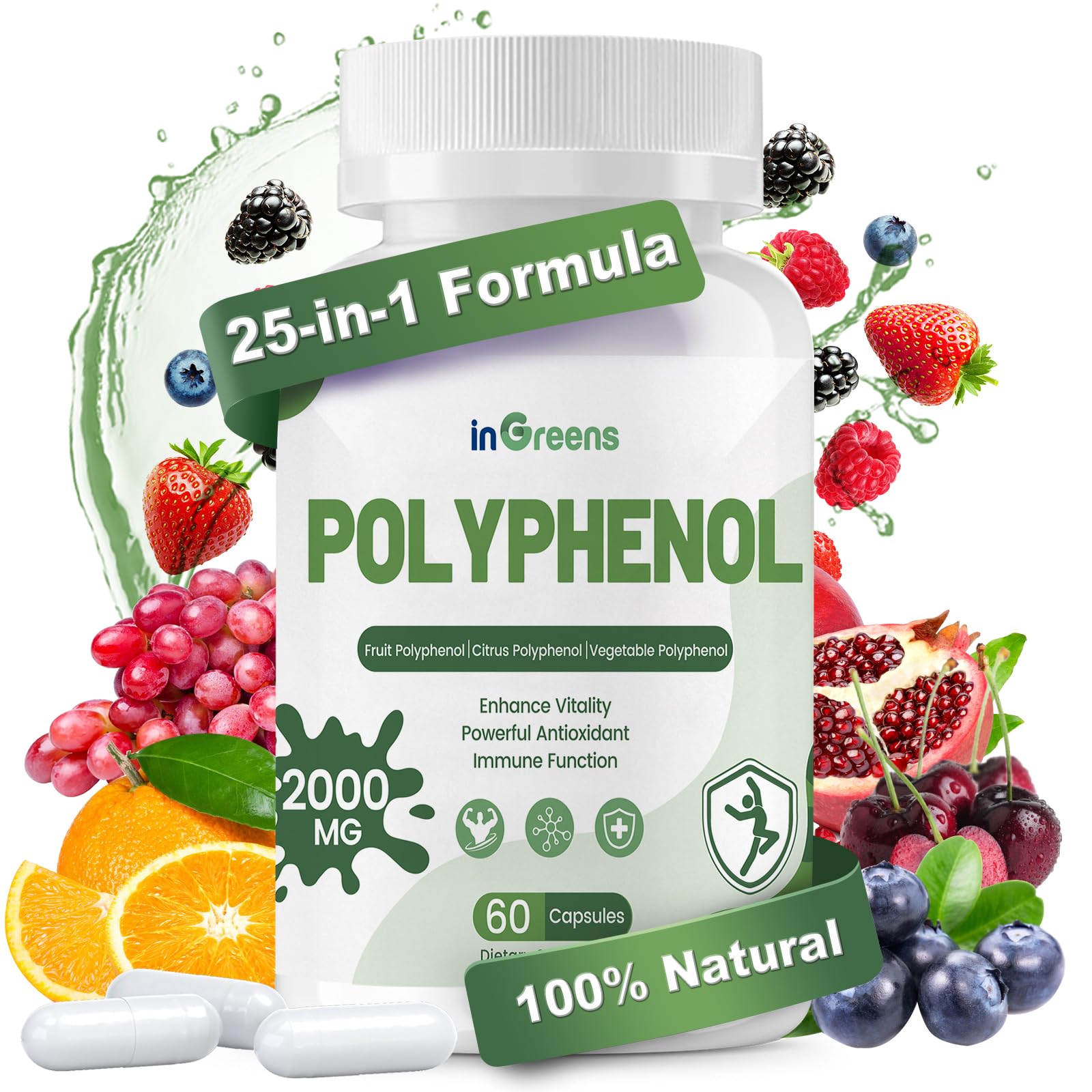25-in-1 Polyphenols Supplement 2000MG Powerful Antioxidants & Polyphenol for Age Defense Polyphenol Superfood Quercetin Resveratrol Plant-Based & Energy Immune Support 60 Capsules 60 Count (Pack of 1)