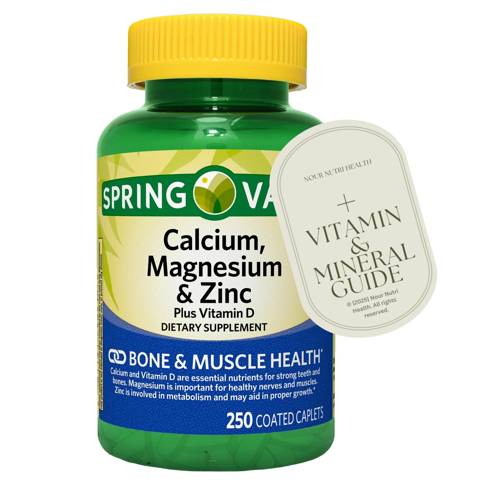 Calcium, Magnesium, Zinc Vitamin D3 Dietary Supplement delivers essential nutrients in one convenient formula. Each 3-caplet serving provides 1,000 mg of calcium to help support bone strength, 400 mg of magnesium to promote muscle and nerve function, 15 mg of zinc for immune health, and 15 mcg (600 IU) of vitamin D3 to assist with calcium absorption. This clean-label formula contains no gluten, lactose, artificial dyes, or artificial flavors. Each bottle includes 250 coated caplets for a value supply of approximately 83 days when taken as directed. Bonus: Includes a digital copy of Nour Nutri Health's exclusive Vitamin Mineral Guide. This eBook is designed to support your supplement routine and help you make informed choices for daily wellness. Access instructions are provided after purchase. this is only Ebook not physical book.