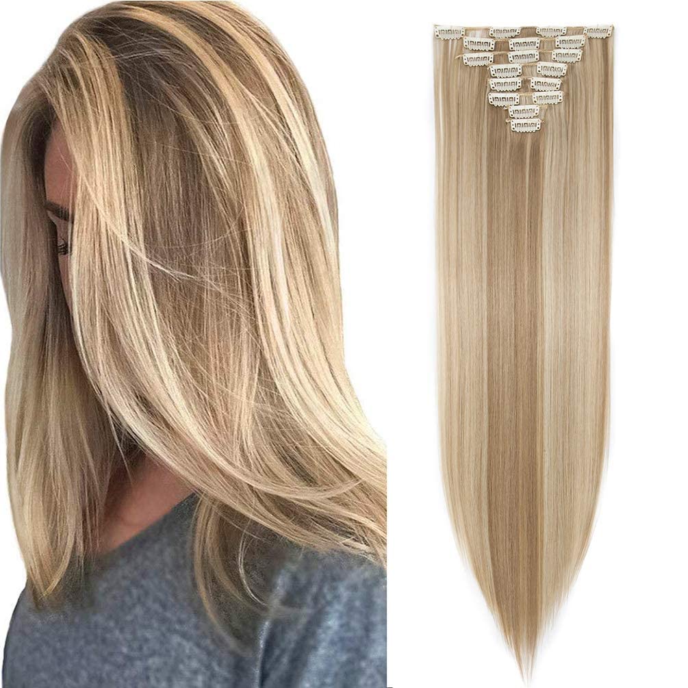 26" Long Straight Clip in Hair Extensions Full Head 8Pcs 18Clips Ombre Colorful Synthetic Hair Clip in Hairpiece Sandy Blonde mix Bleach Blonde Sandy Blonde mix Bleach Blonde 26 inch