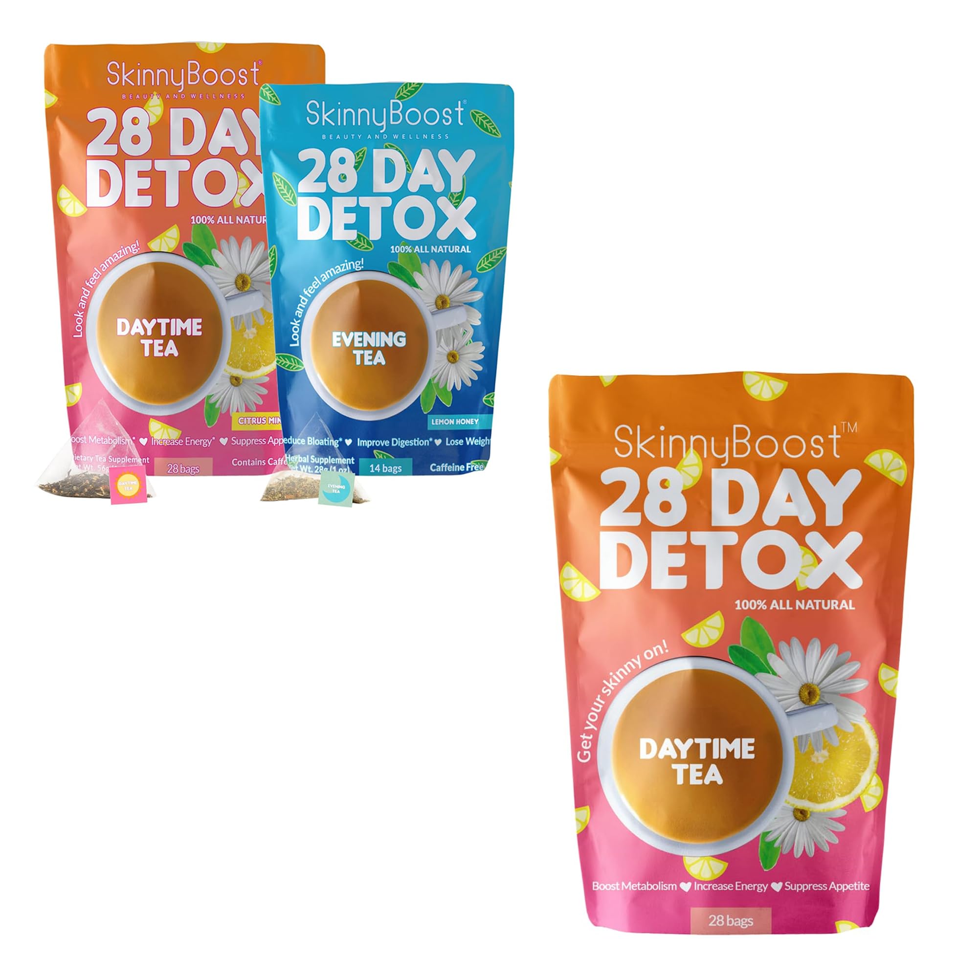 Trusted Wellness Brand – SkinnyBoost has been crafting high-quality detox teas for over 15 years, promoting a natural approach to weight management wellness. Non-GMO, Vegan Keto-Friendly – Made with pure, natural ingredients, free from GMOs, gluten, soy, and artificial additives, perfect for intermittent fasting. Evening Tea for Digestive Health – The Herbal Detox Tea promotes gut health, reduces bloating, and supports cleansing with gentle ingredients like senna leaf. Metabolism Energy Support – The Citrus Mint Daytime Tea helps revitalize energy levels and support digestion with natural green tea, oolong, and herbs. 28-Day Detox Cleanse Kit – Includes 1 Citrus Mint Daytime Tea (28 Bags) 1 Evening Herbal Tea (14 Bags) for a complete metabolism-boosting cleanse.