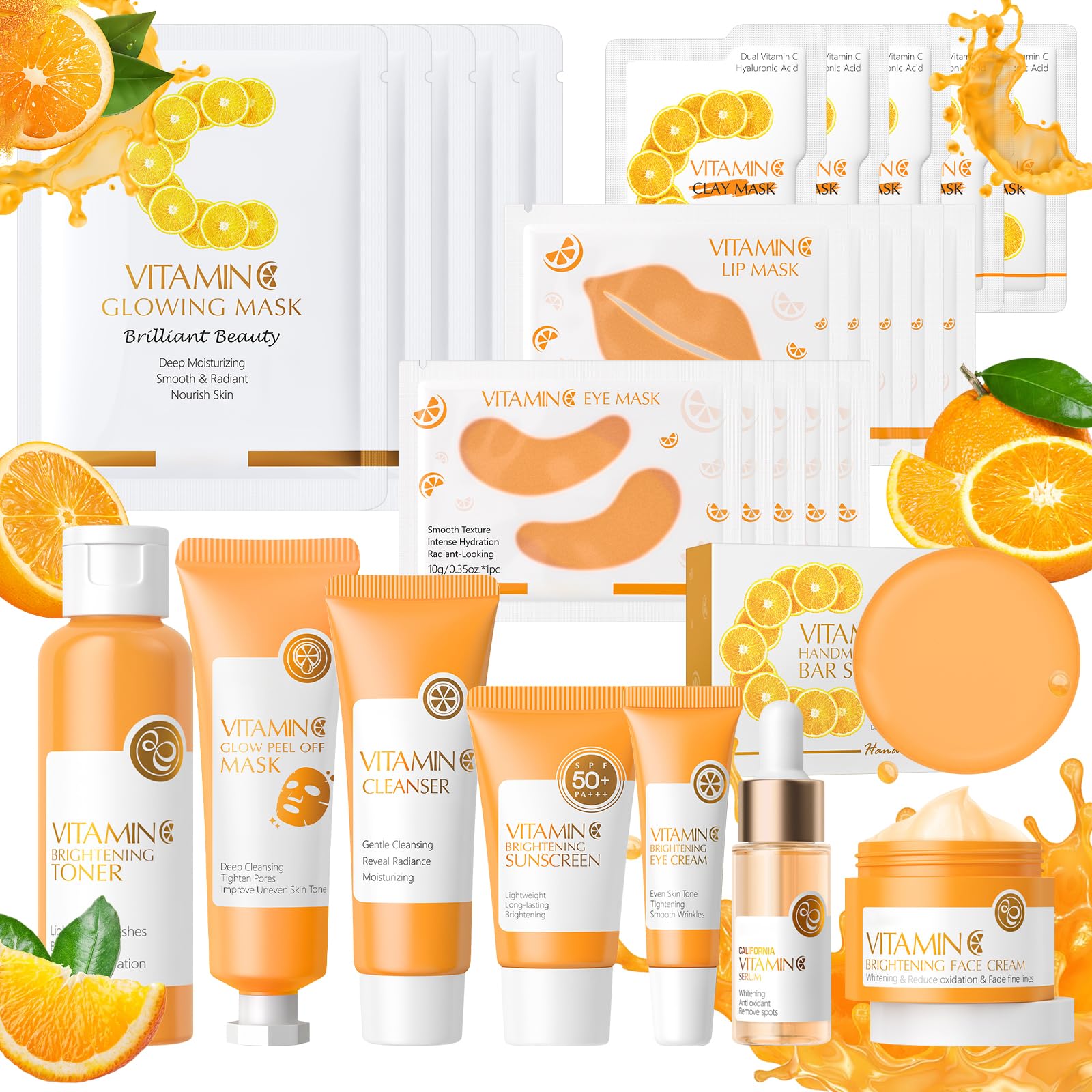 Ideal Gift for Her Whether for your mother, partner, daughter or sister, this deluxe vitamin c skincare set would be a perfect choice that makes it a thoughtful gift for special occasions like Christmas, Valentine's Day and Mother's Day. Attach a beautiful gift box, which can be given to her as a beautiful package of this skincare set!. Travel Friendly Design The vitamin c facial skin care set is also a great travel kit for teen girls. As a compact travel skincare set, it is designed to be easily carried during travels. All the products are conveniently sized for travel. It provides all the necessary face care in a small package, making it an essential travel companion. Suitable for All Skin Types Our skincare for girls 10-12 is cruelty-free, made for all skin types and tones. This sakura skincare set is ideal for all skin types that are prone toblackheads, redness, acne marks, enlarged pores, dry skin, oily skin, lack of moisture, often stay up late. Skin Care for Teens 10-12 Our vitamin c skin care for teens 10-12 can stimulate collagen, reduce fine lines and wrinkles and nourish the skin. Reduce puffiness, eye bags, crow's feet and dark circles, lift and tighten the skin around eyes. Keep lips moist and repair chapped lips. Travel size skincare set achieve long-lasting moisturizing and skin care effects. 28 PCS Vitamin C Skin Care Set Vitamin C skincare gift set for teen girls, a perfect way to pamper yourself with beauty and relaxation! Contained cleanser, toner, serum, face cream, eye cream, sunscreen, lip mask, eye mask, mud mask, moisturizing facial mask, peel off mask and soap bar, all extracts from vitamin c. From face to eye to lip, our skincare set has all to keep your skin looking young, nourished!.