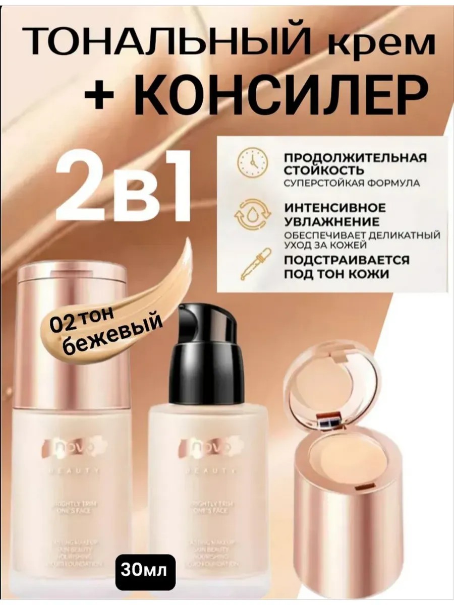 2в1 Тональный крем + консилер тон 02 — удобное средство для идеального макияжа в одном флаконе. Тональный крем обеспечивает ровное, натуральное покрытие и увлажнение кожи, а консилер, расположенный отдельно на крышке, легко скрывает темные круги и несовершенства. Такая компоновка позволяет точно наносить консилер в нужных зонах, не утяжеляя лицо, и быстро создавать безупречный образ. Формула не забивает поры, комфортна в течение дня и подходит для всех типов кожи.