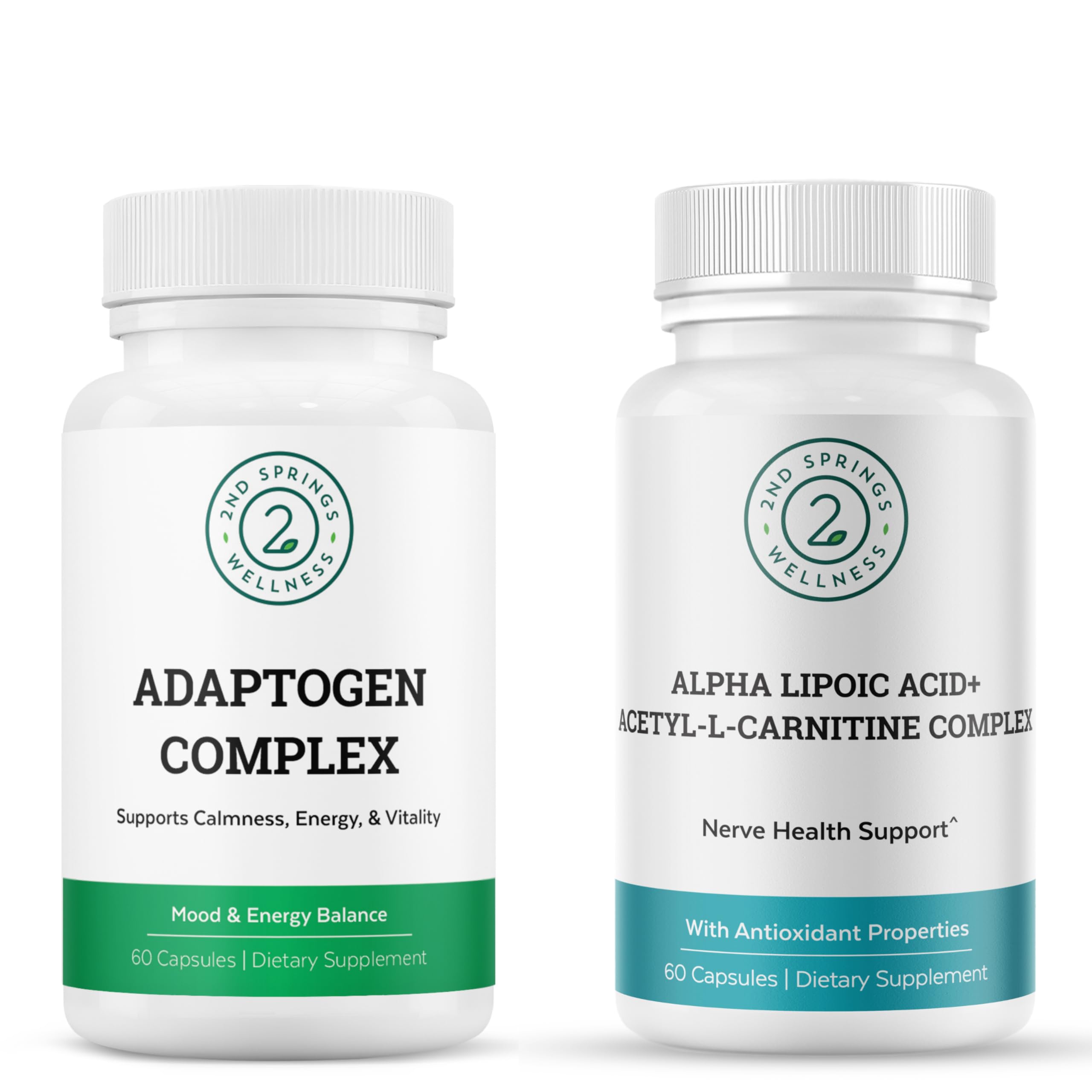 The ALA ALC Complex Adaptogen Complex Bundle by 2nd Springs offers a powerful combination of cognitive support, metabolic nutrition, and stress resilience for individuals seeking balanced daily performance. The ALA ALC Complex promotes mitochondrial efficiency, cleaner energy production, antioxidant protection, and improved cognitive clarity — making it ideal for supporting focus and long-term cellular health. Complementing this, the Adaptogen Complex delivers a comprehensive blend of traditional botanicals known to support mental endurance, and emotional balance. Together, these supplements create a holistic routine that enhances energy, sharpens focus, improves mood stability, and strengthens overall resilience. Designed for everyday use, this bundle provides a natural, clean approach to supporting both mental and physical wellness throughout busy and demanding lifestyles.Clean, easy-to-take formulas for everyday wellness - Both supplements are non-GMO and crafted without unnecessary additives, offering a clean wellness routine suitable for daily use. When taken together, they support sharper thinking, steadier energy, stronger stress response, and overall mind-body harmony. Synergistic benefits for mood, endurance, and cognitive performance - While ALA ALC supports metabolic energy and neural clarity, adaptogens reinforce stress management and mental stamina. This pairing is ideal for busy professionals, students, active individuals, or anyone seeking improved daily performance and balanced mood. Adaptogen Complex for resilience and calm focus - Featuring a blend of Ashwagandha, Rhodiola, Ginseng, Holy Basil, Schisandra, and Cordyceps, the Adaptogen Complex helps support healthy cortisol levels, emotional balance, mental endurance, and stress resilience. These botanicals work together to promote calm and sustained focus without stimulants. ALA ALC for mitochondrial function, clarity, and antioxidant support - Alpha Lipoic Acid (ALA) and Acetyl-L-Carnitine (ALC) work synergistically to support cellular energy production, nerve health, metabolic balance, and antioxidant defense. This formula helps promote mental sharpness, cleaner energy, and improved metabolic performance throughout the day. Daily support for energy, focus, stress balance, and overall vitality - This bundle combines the ALA ALC Complex with a full-spectrum Adaptogen Complex to support mitochondrial energy, cognitive clarity, healthy stress response, mood balance, and long-term resilience. Together, they help promote clean, steady energy and comprehensive daily wellness.