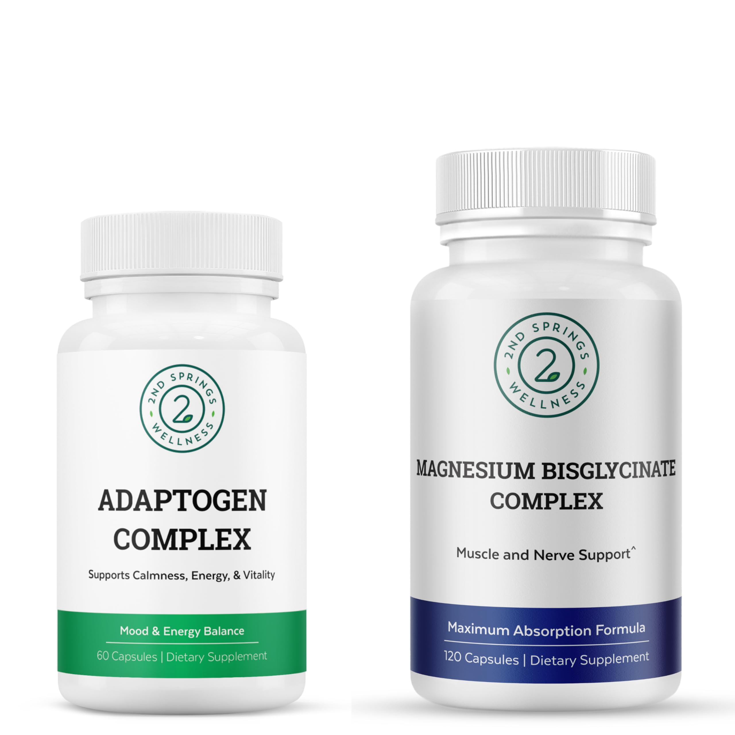 The Magnesium Bisglycinate Adaptogen Complex Bundle from 2nd Springs brings together two complementary formulas designed to promote calm, balance, and daily resilience. Magnesium Bisglycinate delivers a gentle, bioavailable form of magnesium that supports muscle relaxation, nerve health, and more restful evenings, making it ideal for those seeking ease from tension or heightened daily demands. The Adaptogen Complex blends traditional botanicals including Ashwagandha, Rhodiola, Ginseng, Holy Basil, Schisandra, and Cordyceps — each chosen for its ability to help the body adapt to stress, maintain steady energy, and promote clear, focused thinking. When used together, these supplements create a holistic foundation for emotional steadiness, physical recovery, and overall well-being. This bundle is a simple, supportive way to bring more calm, clarity, and balance into your everyday life.Clean formulas designed for daily use - Both supplements are non-GMO and made without artificial fillers, supporting a clean, consistent wellness routine. Use them together for a simple approach to managing stress, supporting muscle comfort, and promoting overall balance. Synergistic support for mood, fatigue, and overall wellness - Magnesium helps regulate the nervous system while adaptogens support balanced cortisol and mental endurance. This combination offers a powerful approach for those seeking natural stress relief, improved daily performance, and grounded energy. Adaptogens to support stress response and mental clarity - The Adaptogen Complex features Ashwagandha, Rhodiola, Ginseng, Schisandra, Holy Basil, and Cordyceps to help promote calm under pressure, steady energy, improved focus, and overall emotional resilience without jitters or crashes. Gentle Albion TRAACS magnesium for muscle and nerve support - Magnesium Bisglycinate offers superior absorption with a gentle digestive profile, supporting muscle relaxation, healthy nerve function, sleep quality, and recovery. Ideal for eg tension from workouts, long workdays, or busy routines. Two powerful formulas for daily calm and balance - This bundle pairs highly absorbable Magnesium Bisglycinate with a premium Adaptogen Complex to support stress management, relaxation, clarity, and overall mood balance. Together, they help reinforce a sense of daily steadiness and resilience.