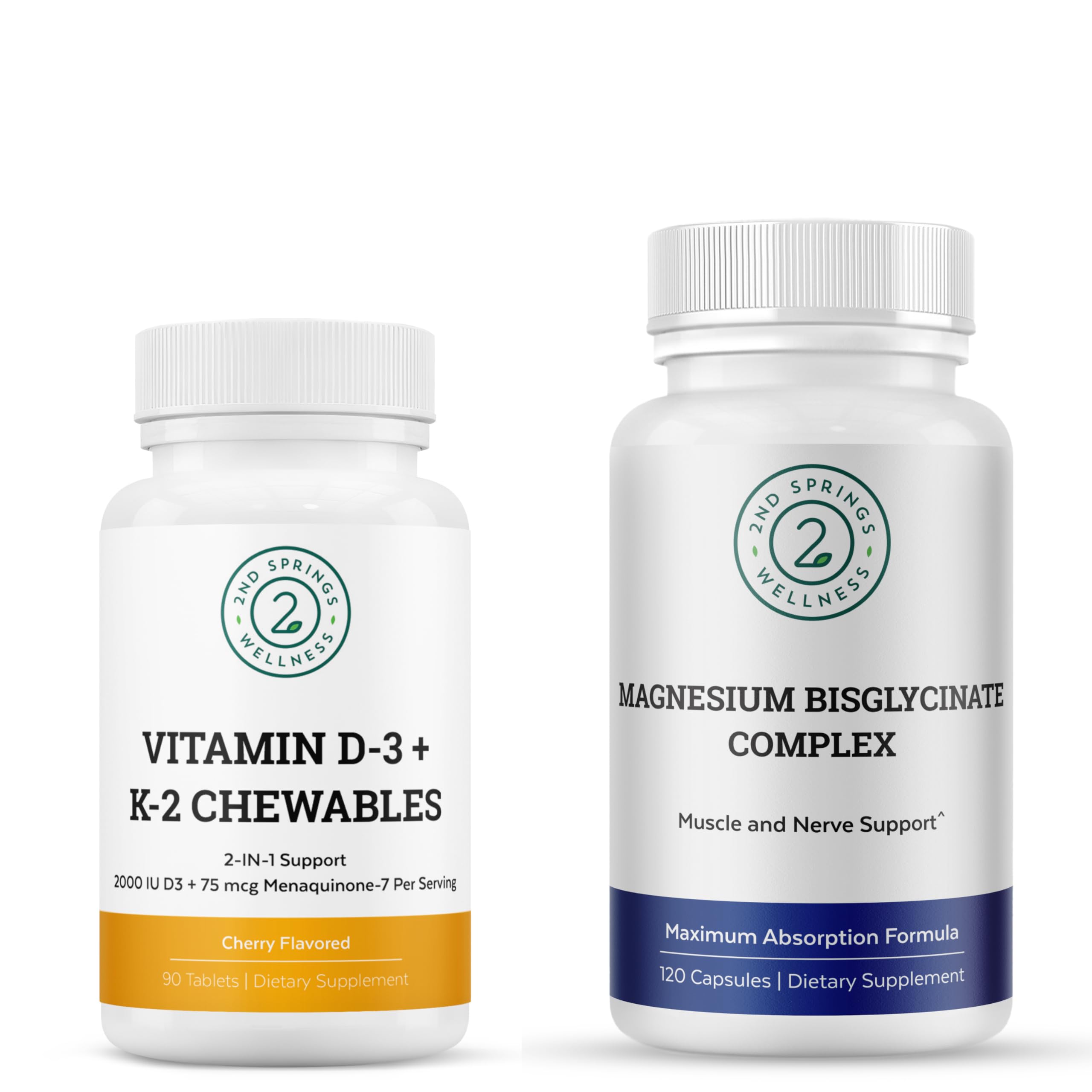The Magnesium Bisglycinate Vitamin D3 K2 Complex Bundle from 2nd Springs provides a complete foundation for bone strength, muscle function, and overall daily wellness. Magnesium Bisglycinate offers superior absorption and gentle digestion, helping support muscle relaxation, healthy nerve function, stress recovery, and nighttime rest. The D3 K2 Complex delivers two essential vitamins that work together to optimize calcium absorption, promote strong bones, reinforce cardiovascular health, and support immune function. When combined, these nutrients create a synergistic system: magnesium aids vitamin D activation, vitamin D enhances calcium uptake, and vitamin K2 ensures calcium is delivered to bones where it's needed. This bundle offers a simple yet powerful way to support mobility, structural strength, energy balance, and long-term wellness — ideal for anyone seeking a clean, effective, and easy daily supplementation routine.Clean formulas designed for dependable daily use - Both supplements are non-GMO and crafted without unnecessary fillers, offering a clean approach to everyday wellness. Taken together, they support balanced mood, strong bones, relaxed muscles, immune resilience, and overall body harmony. Synergistic nutrients for stronger bones and smoother daily function - Magnesium supports Vitamin D metabolism and helps activate enzymes involved in bone formation, while K2 ensures proper calcium placement. Together, these supplements deliver powerful, coordinated support for bone density, mobility, and muscular ease. Vitamin D3 K2 for bone, heart, and immune health - The D3 K2 Complex combines vitamin D3 for immune and bone support with vitamin K2 (MK-7) to help guide calcium into bones and away from arteries. This pairing is essential for maintaining strong skeletal structure and long-term cardiovascular wellness. Albion TRAACS magnesium for muscle and nervous system support - Magnesium Bisglycinate uses a chelated, easy-on-the-stomach form that supports muscle comfort, nerve signaling, stress balance, and more restful sleep. It's ideal for relieving tension, enhancing recovery, and promoting daily calm. Dual support for bone strength, muscle function, and overall balance - This bundle pairs gentle, highly absorbable Magnesium Bisglycinate with a premium D3 K2 Complex to support strong bones, muscle relaxation, healthy calcium utilization, immune strength, and daily wellness. Together, they create a foundational nutrient combination for long-term vitality.
