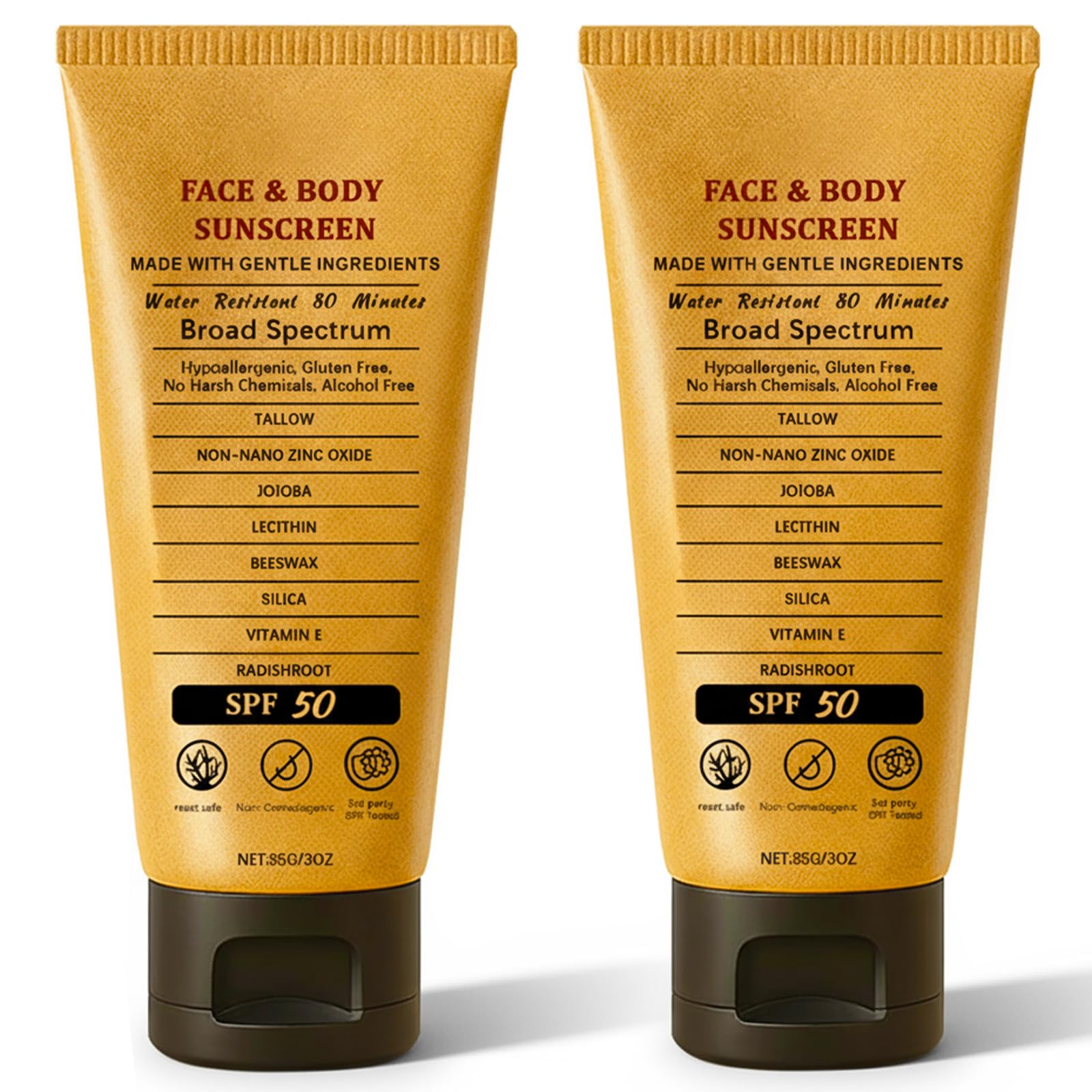 Product Name: Sunscreen Tallow Dimensions: 5.5 x 13.4 cm Net Weight: 85 g Quantity: 2 pcs Beef Tallow Sun Screen Ingredients: ?Water ?Titanium Dioxide ?Beef Tallow ?Silicone ?Jojoba Oil ?Beeswax ?Radish Root Extract ?Vitamin E Beef Tallow Sunscreen with Zinc Oxide Features: 1: Long-lasting, effective sun protection 2: Suitable for face and body 3: Non-irritating, suitable for all skin types, including sensitive skin 4: Gentle, non-greasy texture 5: Deeply nourishes, repairs dry, damaged skinSuitable for All Skin Types: Due to tallow based sunscreen natural and clean ingredients, this product has a gentle texture and is suitable for women, men and sensitive skin. It is the first choice for oily or dry skin seeking light sun protection. Deeply Nourishing and Moisturizing: beef tallow sunscreen organic infused with shea butter and vitamin E, effectively improves dry skin. Whether exposed to harsh environments like deserts or air-conditioned rooms, it strengthens the skin's moisture barrier and prevents peeling. Beef tallow sunscreen organic's emollient formula creates a breathable barrier that locks in moisture all day, preventing dryness and leaving skin supple and hydrated. Waterproof, Sunproof and Non-Grey: beef tallow sunscreen organic provides reliable and non-toxic protection that is safe and non-toxic and will not harm coral reefs or marine life. Ideal for beach vacations, road trips, or everyday carry. SPF 50 High-Performance Sunscreen: beef tallow sunscreen formulated with non-nano zinc oxide and mineral sunscreen, it provides broad-spectrum protection. Suitable for use on multiple areas, including face, hands, legs, and back. Immediately upon application, it provides strong sun protection, providing a reliable barrier for everyday travel and outdoor activities. Natural Tallow Formula: This beef tallow sunscreen is made with 100 grass-fed beef tallow, beeswax, and vitamin E. It's a blend of select animal-derived ingredients and minerals, free of fragrance and synthetic oils. Tallow sunscreen deeply nourishes, hydrates, and repairs skin, strengthening its protective barrier against environmental stressors.