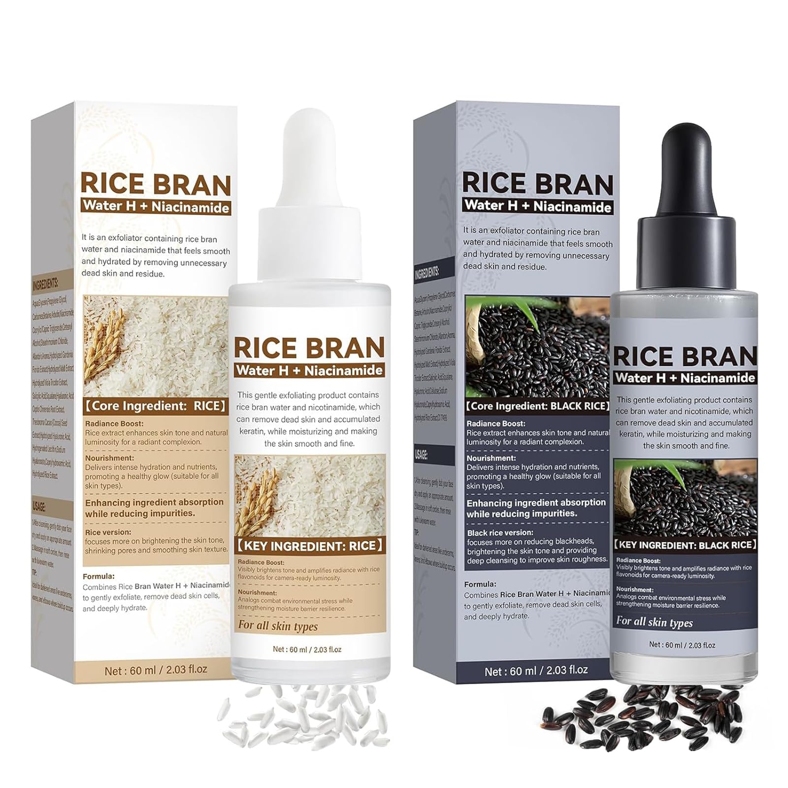 Effortless Skincare Upgrade: Use 3-4 drops of this hydrating exfoliant morning and night after cleansing. The lightweight facial serum absorbs quickly and pairs well with retinol or vitamin C serums, making it easy to enhance any skincare routine. Soothing Skincare Ampoule: This vegan-friendly skincare ampoule is suitable for all skin types, providing a gentle, non-abrasive exfoliating experience, especially for sensitive skin. Pore Minimizer Solution: This exfoliating solution targets blackheads and whiteheads using rice extracts and glycerin. As a pore minimizing rice ampoule, it visibly brightens and helps fade marks, supporting a clearer look on all skin types within 8 weeks. Deep Hydration: Ball up skin cells dirt oil afterward you pores were clearer, with fewer white and black heads. This multi-level exfoliation process clears away unnecessary dead cells to reveal smoother skin underneath.Achieve smoother, plumper skin with balanced hydration. Dual-Action Exfoliation: Features both black and white rice exfoliating solutions, each 60ml, Smoothly remove skin cells and refine texture with this face exfoliant, promoting a revitalized complexion and clearer pores for radiant skin.