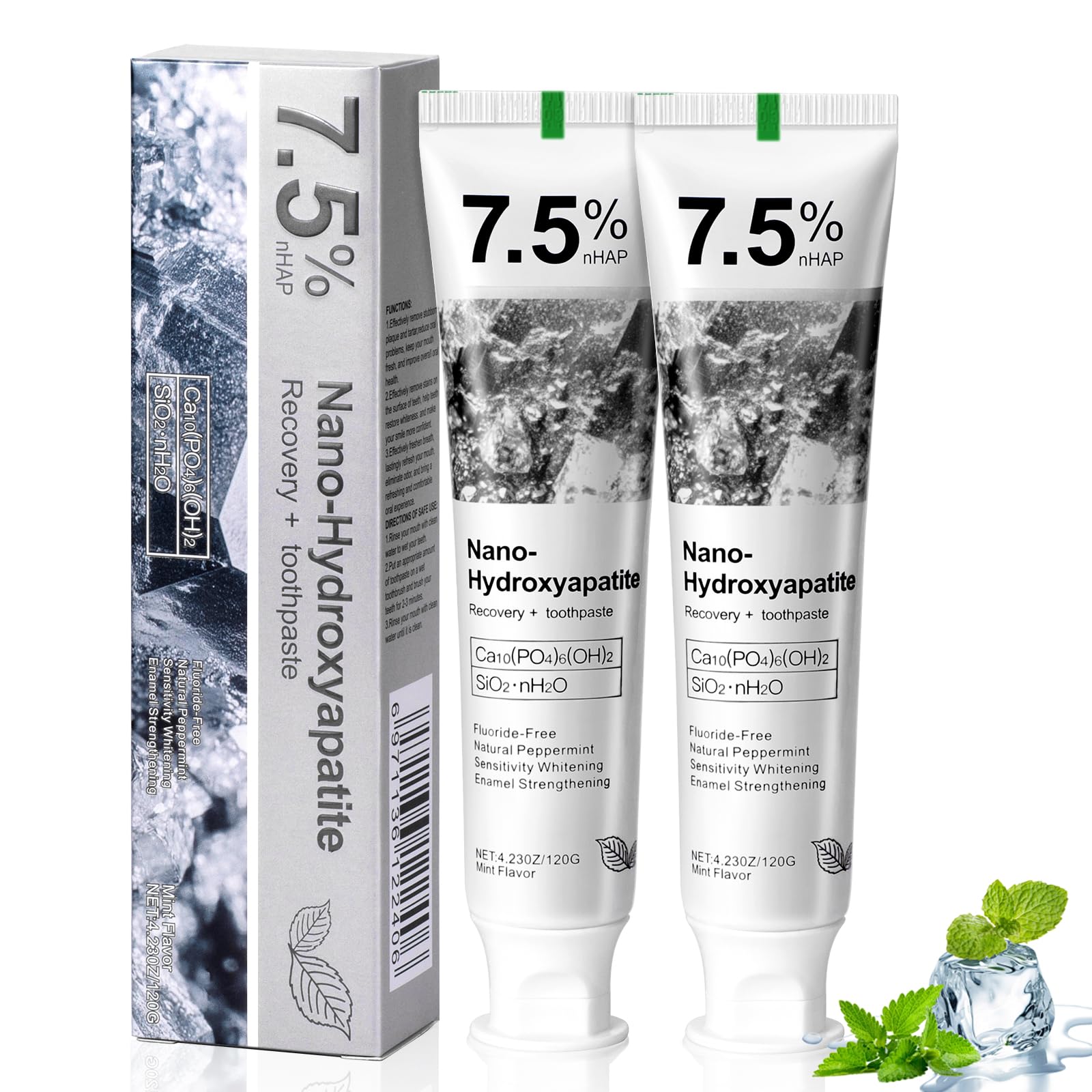 2PCS Hydroxyapatite Toothpaste 7.5 for Enamel Protection Fluoride-Free Toothpaste for Sensitive Teeth Fresh Breath Mild Mint Flavor 4.23 oz