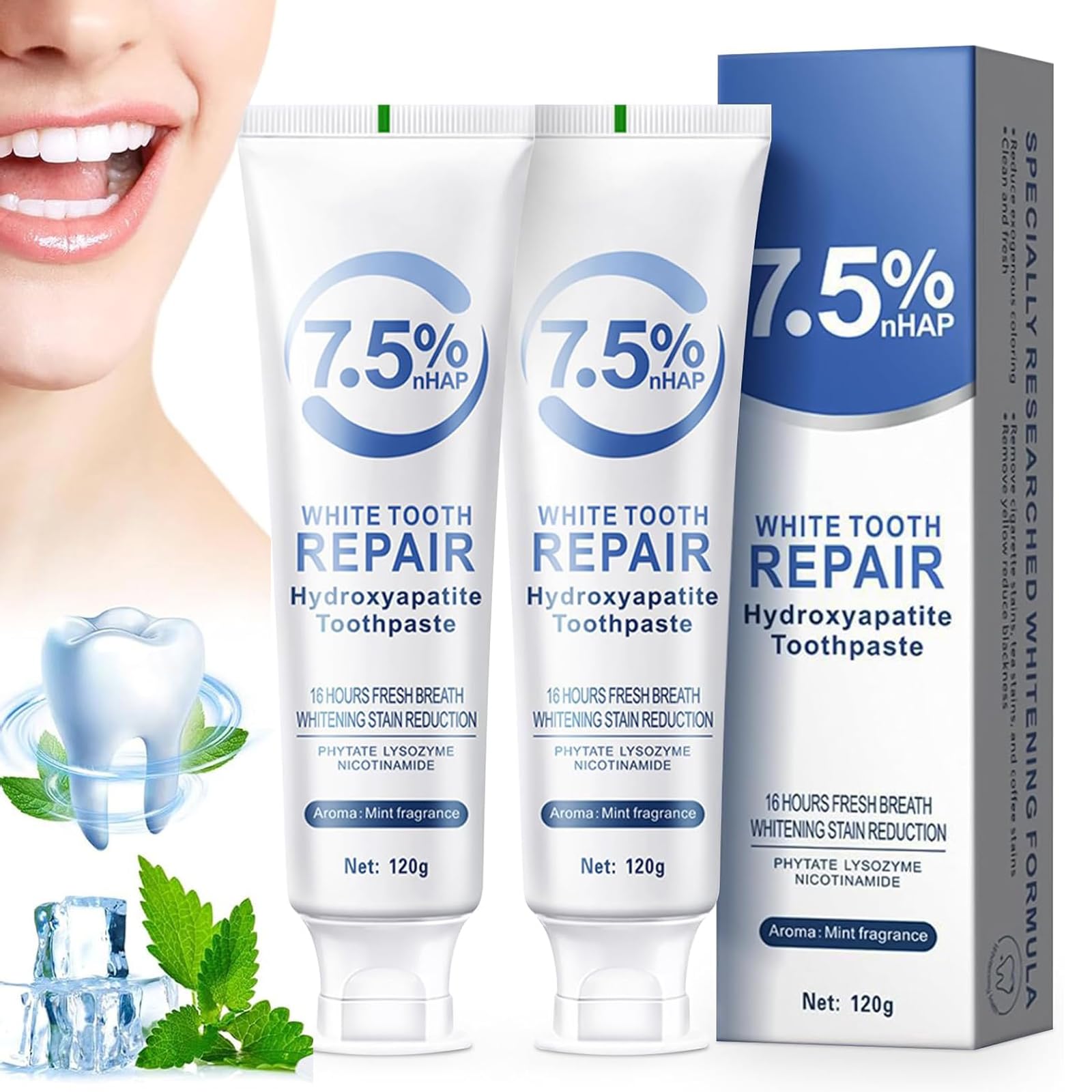 Note: For environmental protection, 2 toothpastes are packed in one box. Easy to Use: Just slightly squeeze, apply a piece of toothpaste on the toothbrush, and brush as usual. Brush your teeth with it for 3 minutes, twice a day for best results. Long-lasting Freshness: Our toothpaste keeps your refreshing breath, The fresh mint flavor leaves your breath feeling refreshed for hours. Gentle for Sensitive Teeth: fluoride-free formula is gentle yet effective, specifically designed to cater to the needs of individuals with sensitive teeth, reducing discomfort during and after brushing, and protecting your teeth from daily wear and tear. Advanced Enamel Protection: The hydroxyapatite toothpaste is designed to repair and protect tooth enamel, reducing the risk of cavities, maintain oral health. Hydroxyapatite-Enriched Formula: Powered by hydroxyapatite, a naturally occurring mineral that helps effectively restore and strengthen tooth enamel, protecting your teeth from daily wear and tear.