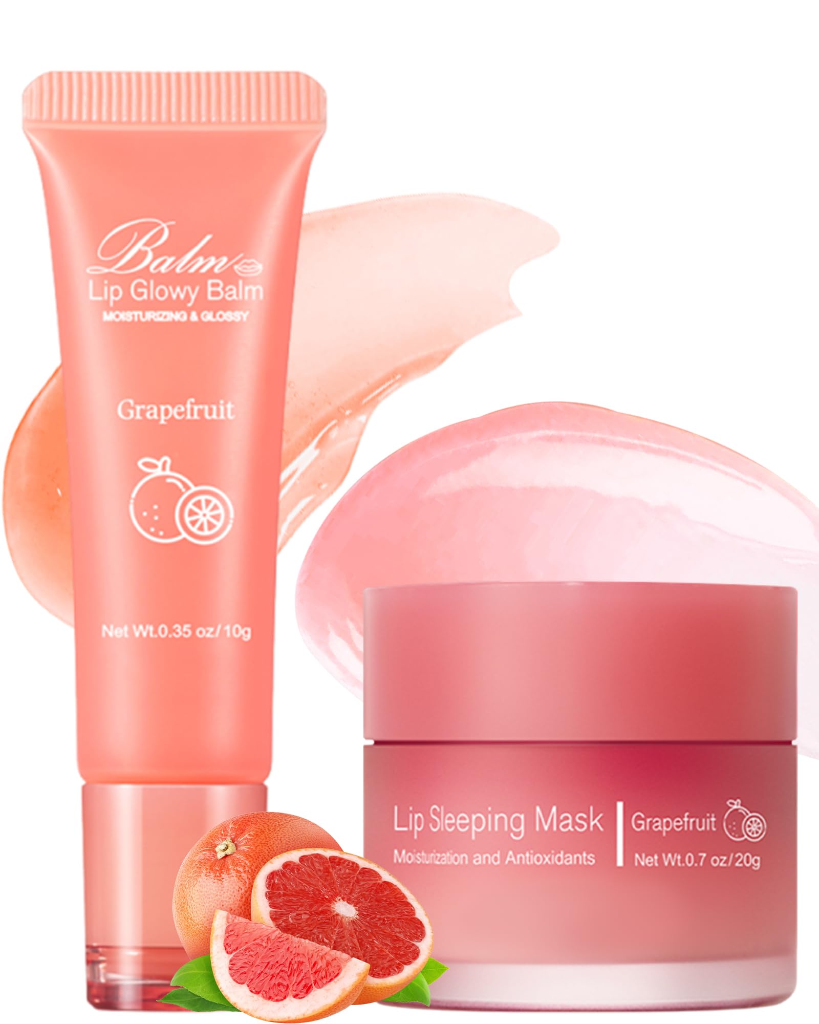 2Pcs Lip Glowy Balm & Lip Sleeping Mask Hydrating Repair Sleeping Lip Mask Glossy Tinted Lip Balm Smooth Cracked Chapped Lip Lip Care Therapy Treatment Christmas Makeup Gift for Women-Grapefruit Set 3# Grapefruit