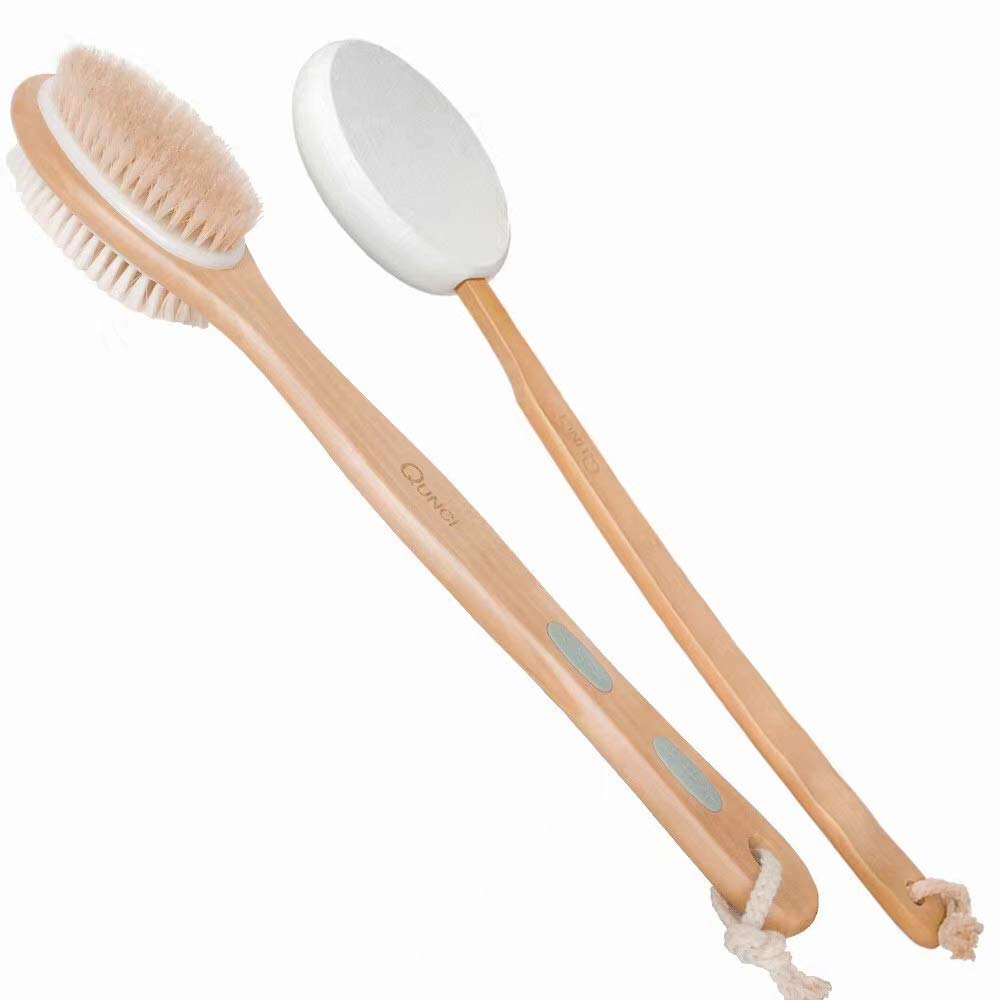 QUNCI Shower Brush: Exfoliating, and remove dirt and dead skin in pore, excess oil and residue to make skin healthier. Body brush can massage the skin, soften the stearic fat deposits under the skin, help reduce the appearance of fat mass, make the skin softer and smoother. Long-term use of dry shower brush can stimulate the body's lymphatic system, promote blood circulation, and help the body detoxify. QUNCI Lotion Applicator Easily apply moisturizers, creams, ointments and gel to hard to reach areas with the QUNCI lotion applicator. The dense foam applicator pads are nonabsorbing but textured to hold lotions in place without dripping or sliding. Measuring over 17 inches long, the curved handle is made with a durable lotus wood with a clear protective finish. Easily Apply Lotions, Creams and Gels. Evenly apply lotions, creams, medicated ointments, gels, moisturizers and sunscreens with the back lotion applicator. Eliminating the need to bend over and painfully twist to apply moisturizers to hard to reach areas, the back lotion applicator handle is over 17” in length, with a 3.5” applicator pad for easy self application. Nonslip Extended Reach Handle: The curved, long reach handle is over 17” and is made of a durable lotus wood that will not split or crack. A nonslip textured grip wrap provides a comfortable and secure grip. Convenient for storage. What’s Included: ?One Shower Brush ?One Removable Handle ?One Replaceable Applicator Pad ?One Free Bag Tips: As the goods are squeezed by other goods during the first transportation, the boar bristles or soft bristles of the brush are a little bent and deformed. Therefore, after the buyer receives the goods, the buyer can use a hair dryer and press the hot key to face the curved bristles, after blowing, the curved bristles will naturally straighten after 5 seconds.QUNCI GUARANTEE: All products are subject to strict quality control and extensive testing, ensure you have a good experience during the bathing process. 60 day unconditional guarantee so you can purchase now with confidence. EASILY SELF APPLY LOTIONS, CREAMS AND GELS: After bathing,Evenly apply lotions, creams, ointments, gels, moisturizers and sunscreens with the QUNCI lotion applicator. Eliminating the need to bend and twist to apply moisturizers to hard to reach areas, Foam rubber applicator is soft on skin and spreads lotions with no absorption. Just squeeze lotion onto the sponge head and apply; wooden handle extends your reach by 17". Applicator comes with rope loop to hang for easy storage and drying. PERFECT LONG HANDLE: The extended wooden handle is over 17” (44cm) long, it allows you to easily clean hard to reach areas. In addition, there is a non-slip rubber patch at the handle, which is not easy to fall off when used. There is also a hanging rope design at the handle, which is used for hanging and storage. DRY AND WET USE: When the bristle is dry, it is a good brush for tightening the skin, smooth the skin, effectively smoothing patches of rough skin. When the bristles are wet, The boar bristles are also great for cleaning any part of the body with body wash or scrubs. PREMIUM DUAL BRUSHES: Natural hard bristle brush can massage the skin, deep cleans the skin surface, improving circulation and skin health. The small boar bristle facial brush is extra soft and safe for use on the sensitive skin of the face and neck for a smoother, softer appearance.Best Sellers Rank: See Top 100 in Beauty & Personal Care. Product Benefits: Softening,Massage,Smoothening,Tightening,Clean,Exfoliating. Item Dimensions LxWxH: 18 x 3.25 x 2.25 inches. Power Source: Hand_powered. Brand: QUNCI. Material: Rubber. : B08BLH48S7. Manufacturer: Qunci. Date First Available: June 22, 2020. Product Dimensions: 18 x 3.25 x 2.25 inches; 9.59 Ounces.