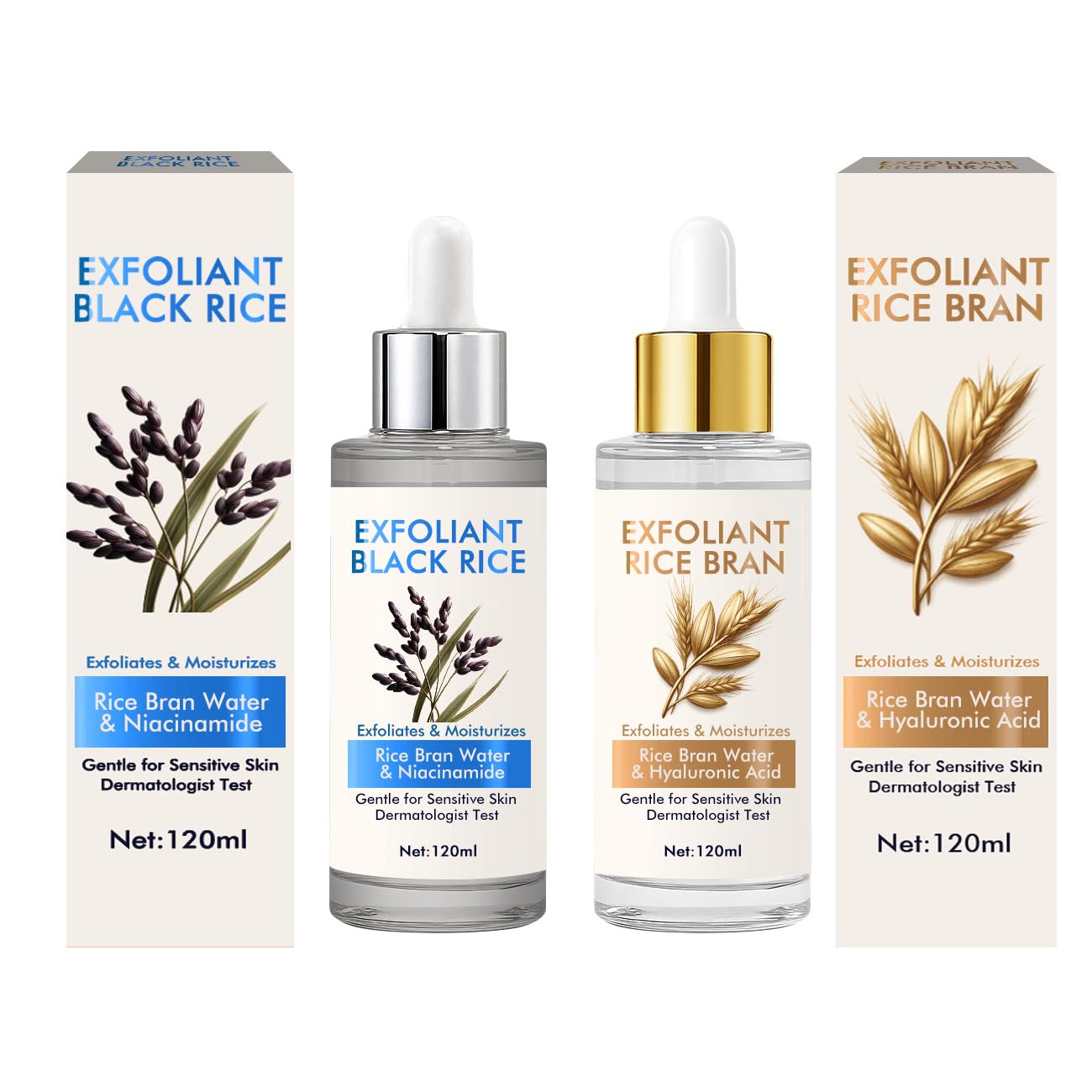 This black rice Exfoliating liquid set opens up a brand-new skin care experience for you. It breaks the limitations of traditional exfoliating products and innovatively combines exfoliation and skin nourishment functions. Every drop contains precious black rice fermentation essence, which can gently exfoliate aged keratin, remove stubborn blackheads and whiteheads, unclog pores, and at the same time regulate sebum secretion, making the skin fresh and non-greasy. Rich in niacinamide and natural moisturizing factors, it takes effect immediately after exfoliation, brightening the complexion, locking in moisture, making the skin delicate and smooth, and radiating a natural glow. Whether you have dry skin, sensitive skin or oily skin, you can find the ideal state of your skin with this set of products. Use it 2-3 times a week and you can easily achieve smooth and radiant skin.EASY SKINCARE UPGRADE: This facial exfoliator is easy to use. Apply 3-4 drops after cleansing your face in the morning and evening. It can be absorbed and pairs perfectly with retinol or vitamin C essence to effortlessly enhance any skincare routine. SOOTHING SKIN CARE AMPOULE: Our facial exfoliator is rich in allantoin, which can soothe irritation and enhance the skin barrier. Vegan, cruelty-free, and free of abrasive particles, safe for sensitive skin!. MOISTURIZING ESSENCE: A facial exfoliator containing hyaluronic acid and niacinamide, it can deeply hydrate, help even out skin tone, ensure long-lasting moisture retention and enhance radiance, making the skin healthier and more balanced. NATURAL AND GENTLE: This facial exfoliator, with ingredients such as rice extract and glycerin, is specifically designed to target blackheads and whiteheads, significantly brightening and helping to fade marks. It supports a clearer appearance for all skin types within 8 weeks. RICE EXFOLIATING AMPOULE: Our facial exfoliator is made with black rice and white rice enzymes, which can smoothly remove skin cells and improve texture, promoting skin tone to regain vitality and look radiant.