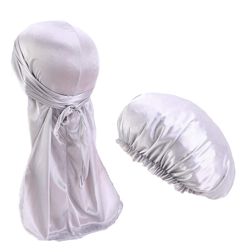 Properties: soft and flexible Durag for everyone. Superior stretchability. Extra long tie Breathable and velvety tissue. Our long headwrap Durag keeps your hair on the spot and keeps his style. For all seasons. Thin, soft and smooth material. Available in different colors and styles. Scope of delivery: 1 x Durag 1 x sleeping hat for the hood. Washing notices: Machine washing or hand washing in cold water. A notice: If it does not meet your expectations, please contact us and we will try our best to offer you quality service! About the shipping: If you urgently need the article, better choose ""Fulfilled by "", then it will be sent from US camp.Or the article is sent from China and needs 14-31 days to arrive.very fashionable, soft and light, comfortable for women.The elastic band of the stretchy hood stays on the skin all night.So your hairstyle left no traces on your forehead.Doesn't tear easily.Also excellent for washing.Scope of delivery: 1 x Durag and 1 x bonnet, Durags suitable for men and women, suitable for women, also for couples.Size: unit size, suitable for most women and men.Material: satin.Eigenschaften: weicher und flexibler Durag für jedermann. Überlegene Dehnbarkeit. Extra lange Krawatte Atmungsaktives und samtiges Gewebe. Unser langes Headwrap Durag hält Ihr Haar an Ort und Stelle und behält seinen Stil. Für alle Jahreszeiten. Dünnes, weiches und glattes Material. In verschiedenen Farben und Stilen erhältlich. Lieferumfang: 1 x Durag 1 x Schlafmütze für die Motorhaube. Waschhinweise: Maschinenwäsche oder Handwäsche in kaltem Wasser. Hinweis: Wenn es nicht Ihren Erwartungen entspricht, kontaktieren Sie uns bitte und wir werden unser Bestes versuchen, Ihnen Qualitätsservice zu bieten! Über den Versand: Wenn Sie den Artikel dringend benötigen, wählen Sie besser ""Fulfilled by "", dann wird er aus US Lager versendet. Oder der Artikel wird aus China versendet und benötigt 14-31 Tage, um Sie anzukommen.Sehr modisch, weich und leicht, bequem für Damen. Das elastische Band der dehnbaren Haube bleibt die ganze Nacht über auf der Haut. So bleiben Ihre Frisur keine Spuren auf der Stirn hinterlassen. Reißt nicht leicht. Auch hervorragend zum Waschen. Lieferumfang: 1 x Durag und 1 x Motorhaube, Durags geeignet für Männer und Frauen, geeignet für Frauen, auch für Paare. Größe: Einheitsgröße, passend für die meisten Frauen und Männer. Material: Satin.2 Stück Set Durag und Motorhaube, langer Schwanz, Satin, Doo Lappen, elastisch, Schlafkappe, einfarbig Einheitsgröße Grau