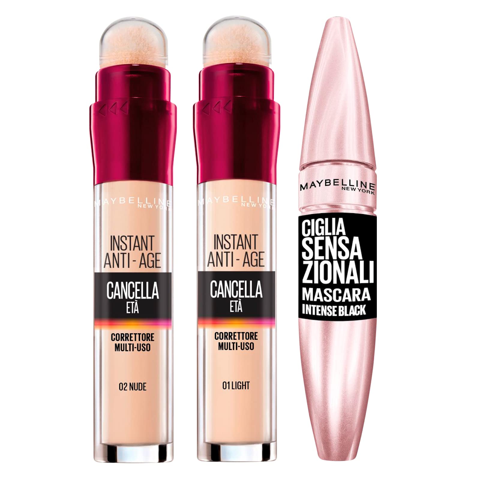 1x Maybelline New York Sensational Eyelashes Volumizing Mascara Intense Black.1x Maybelline New York Liquid Concealer Age Eraser 01 Light.1x Maybelline New York Age-Eraser Liquid Concealer 02 Nude.The kit contains:.