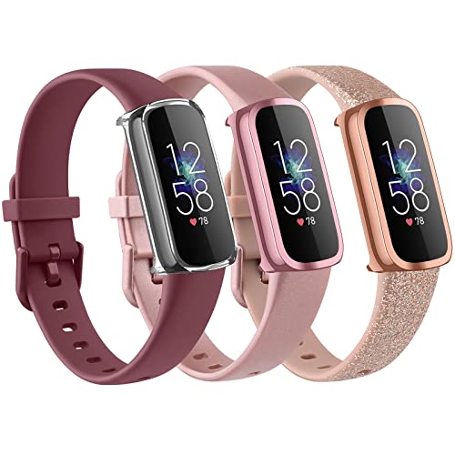 3 Pack Bands for Fitbit Luxe Bands with Screen Protector Case Soft Silicone Sport Replacement Wristbands Strap for Fitbit Luxe Women Large Wine Red+Rose Gold+Shiny Rose Gold