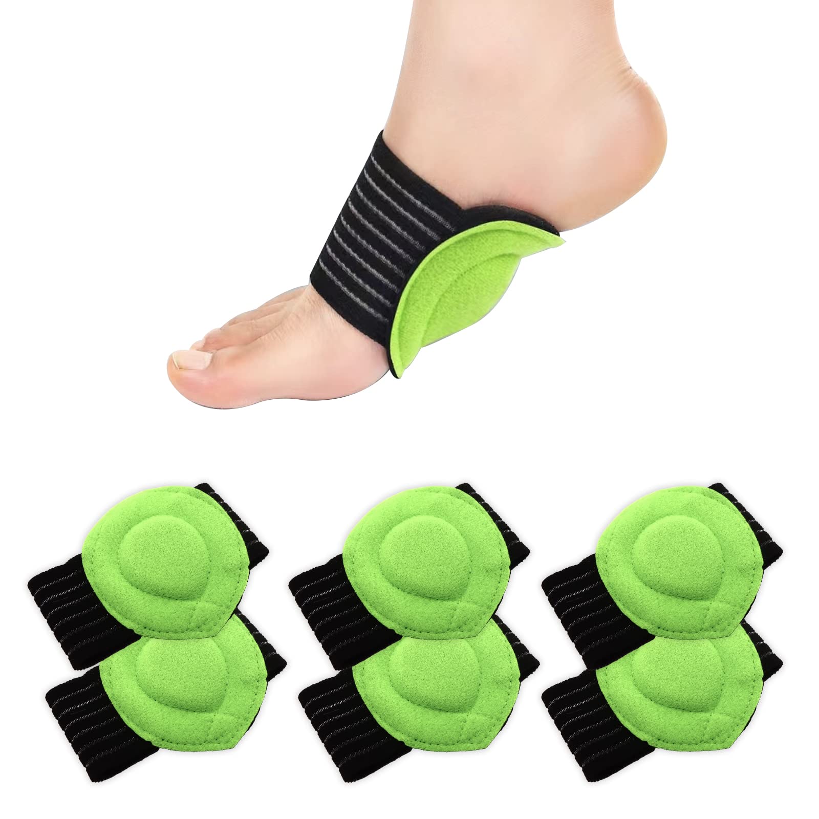 Specification: Quantity: 3 pairs Colors: Green Black. Materials: SBR,Fabric (Washable, Reusable, Anti-skid). Dimensions: Bandage: 4.1 x 2.55 in 10.5 x 6.5 cm Foot pad: 3.74 x 2.95 in 9.5 x 7.5 cm Application: Sole Angels are best for reducing foot pains such as heel pain, plantar fasciitis, pain in the ball of your foot, metatarsalgia. Provide support to fatigued or flat feet while aligning the body to reduce pain in back knees.[DURABLE, WASHABLE REUSABLE]: 3 pairs of replaceable, reusable, hand washable, so that you can wear our soft arch pads every day, perfect for athlete, dancer, model, worker, elder, police. [APPLICATIONS]: Sole arch support brace are best for reducing plantar fasciitis, flat feet, heel spur, high arch aggravation relieve arch pain and heel pain from long time standing and walking. [FIT FOR ANY SHOE]: Wear your compression cushioned support sleeves with any shoes, heels, sandals, or even barefoot to help reduce your feet pain. Great to wear during running, exercising, playing sports, or simply all day at work or home. [ERGONOMIC DESIGN]: Includes a durable non-slip sole and shock-absorbing core for all day comfort and support. The compression band hugs the foot for maximum support with breathable fabric for a perfect fit promoting balance and body alignment. [MATERIAL]: It is made of latex sponge and EVA, with good elasticity, strong absorption capacity and good shock absorption and pressure reduction performance. Velvet is used to fit the foot center, which has good elasticity and sweat absorption characteristics.