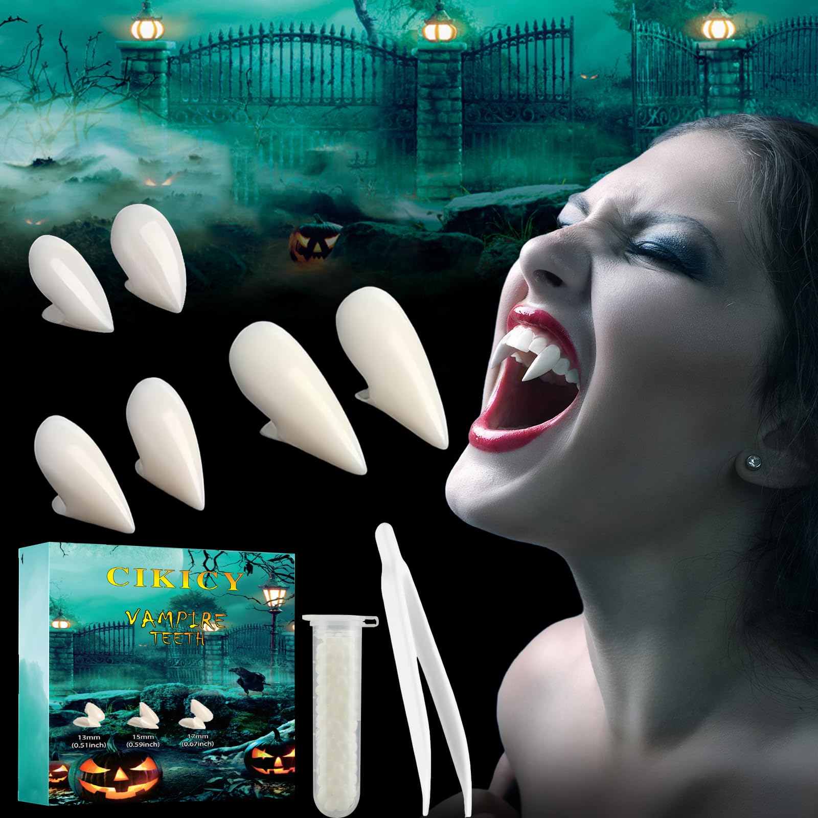 This set includes 3 pairs of vampire fangs in 3 different sizes: 13mm, 15mm, and 17mm, along with 1 tube of tooth-particle glue, 1 pair of plastic tweezers, and 1 instruction manual (English not guaranteed). A perfect combination of Halloween party supplies to meet your various cosplay needs, these fangs are quick and easy to use no other tools are required. Halloween fangs, as eye-catching decorations and accessories, are popular at events like Halloween. Medical-grade resin is used to make these fangs, ensuring excellent safety. Whether for makeup, performances, or various themed parties, people can feel comfortable wearing these fake teeth. Clean the false teeth easily with warm water or soap before use. They can be reused many times and will retain their original quality and appearance. SAFETY WARNING Choking hazard: small parts, not suitable for children under 3 years.Easy-to-use Halloween teeth: Use warm water (80-100 degrees Celsius) to heat the adhesive beads of the teeth from white to clear (7 to 8 beads per tooth). Then, squeeze out the excess water and press the adhesive into the teeth. The teeth will dry and mold to the shape of the teeth. For specific instructions, please refer to the accompanying manual. These decorative Halloween teeth are small items and children should use them under adult supervision. More realistic party costume: This pair of realistic vampire teeth is not just a costume accessory it's an immersive experience. And under party lights, this pair of vampire teeth will look even more realistic, making you the center of attention. As a creative and fun holiday activity, it's the perfect opportunity to give a fun gift. Choosing vampire teeth as a gift can showcase unique creativity and personalization, and bring your friends a happy and unforgettable Halloween experience. Safe Material for Confidence: Halloween teeth, as eye-catching decorations and accessories, are popular at events like Halloween. Medical-grade resin is used to make these fangs, ensuring excellent safety. Whether for makeup, performances, or various themed parties, people can feel comfortable wearing these false teeth. Simply clean the false teeth with warm water or soap before use they can be reused many times and will maintain their original quality and appearance. Three Different Tooth Sizes: The vampire teeth measure 13mm, 15mm, and 17mm to meet the needs of different ages and make costumes more realistic. These three pairs of vampire fangs can be used as charming accessories for Halloween costumes and festival activities. Embody the image of a vampire. 1 adhesive strip, 1 pair of tweezers, and 1 instruction manual detailing how to properly apply the vampire teeth using the adhesive. This Halloween costume accessory set allows people to better embody vampires or other scary characters. Halloween activity accessories for adults and children: This Halloween event is suitable for participants of all ages adults and children alike can find their own enjoyment. The vampire teeth are a versatile accessory that complements holiday outfits, adds fun to cosplay, and can be used for creative makeup, allowing you to easily transform into a vampire, werewolf, or zombie. These vampire teeth are an excellent choice for unleashing your creativity and getting into the Halloween spirit.CIKICY Lot de 3 paires de crocs de vampire pour enfants et adultes - Accessoires de maquillage d'Halloween de loup-garou - Costumes de vampires pour enfants et femmes - 3 paires de crocs avec colleDESCRIPTION DU PRODUIT DESCRIPTION DU PRODUIT Le lot comprend 3 paires de crocs de vampire, 3 tailles différentes, 13 mm, 15 mm, 17 mm avec 1 tube de colle à particules de dents, 1 pince en plastique, 1 manuel d'instructions (français non garanti). Une combinaison parfaite de fournitures de fête d'Halloween pour répondre à vos différents besoins de cosplay, facile et rapide à utiliser, aucun autre outil n'est nécessaire. Les dents d'Halloween, comme décoration et accessoire accrocheur, sont populaires dans des événements tels que Halloween. La résine médicale est utilisée comme matériau pour la fabrication de dents de crocs, ce qui a une excellente sécurité. Que ce soit pour le maquillage, les spectacles ou diverses soirées à thème, les gens peuvent se sentir à l'aise lorsqu'ils portent de fausses dents. Nettoyez les fausses dents facilement avec de l'eau chaude ou du savon avant utilisation, peuvent être réutilisés de nombreuses fois, les faux crocs peuvent garder leur qualité et leur apparence d'origine AVERTISSEMENT DE SÉCURITÉ Risque d'étouffement : petites pièces, ne convient pas aux enfants de moins de 3 ansDents d'Halloween faciles à utiliser : utilisez de l'eau chaude (80-100 degrés) pour chauffer les perles adhésives des dents du blanc au transparent (7 à 8 gels pour 1 dent), puis égouttez et appuyez sur l'adhésif dans les dents, les dents sont séchées et façonnées sur le dessus des dents. Pour une utilisation spécifique, veuillez vous référer au manuel d'accompagnement. Ces dents décoratives d'Halloween sont de petits objets que les enfants doivent utiliser sous la surveillance d'un adulte. Déguisement de fête plus réaliste : cette paire de dents de vampire réalistes n'est pas seulement un accessoire de déguisement, c'est une expérience immersive. Et sous les lumières de fête, cette paire de dents de vampire sera encore plus réaliste, faisant de vous le centre de l'attention. En tant que vacances créatives et amusantes, c'est l'occasion parfaite pour offrir un cadeau amusant. Choisir les dents de vampire comme cadeau peut montrer une créativité et une personnalisation uniques, et apporter à vos amis une expérience d'Halloween heureuse et inoubliable. Matériau sûr à utiliser en toute confiance : les dents d'Halloween, comme décoration et accessoire accrocheur, sont populaires dans des événements tels que Halloween. La résine médicale est utilisée comme 