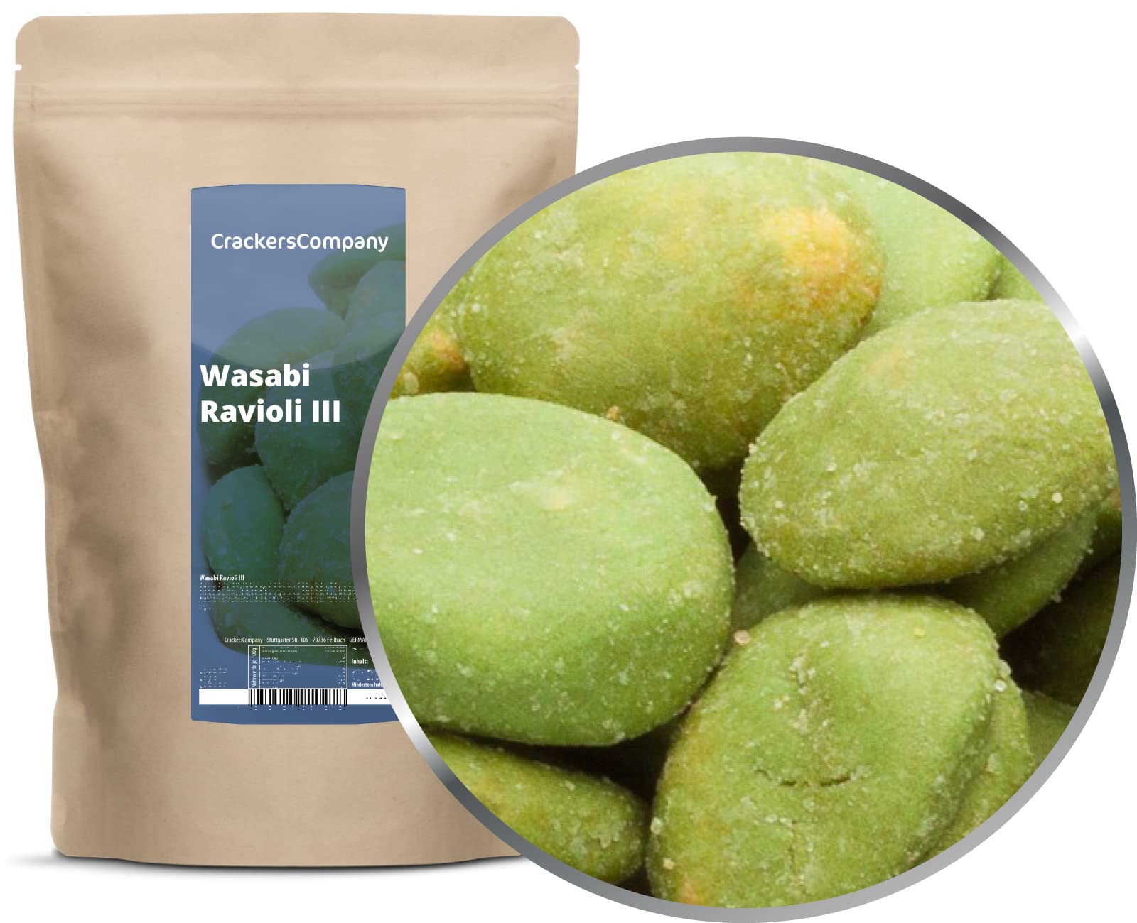 Peanuts wasabi Dreamteam The a little more tightly hell variant of our Wasabi Ravioli III - in terms of sharpness - is quite a challenge for your nose and throat and you also look mercilessly well in your pretty green coat of crispy rice, which of course tastes incredibly racy.A tiny pinch of sugar, which, as you know, of course, reinforces the taste, is the secret ingredient so that the intensity of Wasabi can make a lot of time.The crispy, crisp cover hides the well -protected peanut nucleus inside, which can hardly wait for its destination: Together with the tasteful dough coat and the intense water taste, the nutty temperament of the gentle roasted peanut comes into its own and turns these simple components into its own dreamSnack! Japanese rendevouz with wasabi and peanut If Wasabi and peanut enter into an intimate connection, it can simply result in something delicious.If the whole thing is also presented as a ravioli in a crispy rice dough coat, the pleasure factor can no longer be topped.With our Wasabi Ravioli III we have grabbed a shovel intense wasabi on top and came out of an intensive, Green, Japanese horseradish, tasting crunchy work for any kind of snack time.So far, you may have known the spicy spice only from the Japanese cuisine, world -famous as Wasabipasten, Wasabi is primarily served with soy sauce to Sushi and Sashimi.Reason enough for us to transform this green delicacy into a spicy snack! Ingredients ingredients Wheat flour, peanut kernels (28 ), pipe sugar, modified corn starch, dextrin, palm oil, soy saucenpulver (fermented soy sauce) (wheat, soy), dextrin, salt, dye: ammonia caramel), salt, wasabi powder (26 wasabi-japonica-Plower, horseradish, maltodextrin, glucose, separation agent: silicon dioxide, essence (0.35 ), baking agent: sodium carbonate, dye (e): chlorophyllin. Instructions Store cool, dry and protected by light. Address manufacturer importer CrackersCompany, Stuttgarter Straße 106, 70736 Fellbach, Germany More3 x 350g in zip bag (1,05kg).Erdnüsse Wasabi Dreamteam Die noch ein wenig verschärftere Höllenvariante unserer WASABI RAVIOLI III ist - was den Schärfegrad angeht - eine ziemliche Herausforderung für Deine Nase und Deinen Rachen und sie sehen dabei auch noch gnadenlos gut aus in ihrem hübschen grünen Mantel aus krossem Reis, der selbstverständlich unheimlich rassig schmeckt. Eine winzige Prise Zucker, der, wie man weiß den Geschmack natürlich verstärkt, ist die geheime Zutat, damit die Intensivität von Wasabi nochmal ordentlich zu Buche schlagen kann. Die knusprig, knackige Hülle verbirgt im Inneren den gut geschützten Erdnusskern, der kaum auf seine Bestimmung warten kann: gemeinsam mit dem geschmackvollen Teigmantel und dem intensiven Wasabigeschmack kommt das nussige Temperament der schonend gerösteten Erdnuss wahnsinnig gut zur Geltung und macht aus diesen einfachen Komponenten einen traumhaften Snack! Japanisches Rendevouz mit Wasabi und Erdnuss Wenn Wasabi und Erdnuss eine innige Verbindung miteinander eingehen, kann dabei einfach nur etwas Köstliches daraus entstehen. Wenn sich das Ganze dann auch noch als Ravioli in einem knusprigen Reisteigmantel präsentiert, ist der Genussfaktor eigentlich nicht mehr zu toppen. Wir haben bei unseren WASABI RAVIOLI III noch eine Schippe intensiven Wasabi oben drauf gepackt und herausgekommen ist ein intensiv nach grünem, japanischen Meerrettich schmeckendes Knusperkunstwerk für jegliche Art Snackzeitvertreib. Das pikante Gewürz kanntest du bisher womöglich nur aus der japanischen Kulinarik, weltbekannt als Wasabipaste, wird Wasabi vornehmlich gemeinsam mit Sojasauce zu Sushi und Sashimi gereicht. Grund genug für uns, diese grüne Köstlichkeit in einen würzigen Snack zu verwandeln! INHALTSSTOFFE ZUTATEN WEIZENMEHL, ERDNUSSKERNE (28 ), Rohrzucker, modifizierte Maisstärke, Dextrin, Palmöl, Sojasaucenpulver (fermentierte Sojasauce) (WEIZEN, SOJA), Dextrin, Salz, Farbstoff: Ammoniak-Karamell), Salz, Wasabi-Pulver (26 Wasabi-Japonica-Pulver, Meerrettich, Maltodextrin, Glucose, Trennmittel Wirkstoff: Siliciumdioxid, Essenz (Aroma) (0,35 ), Backtriebmittel: Natriumcarbonat, Farbstoff (e): Chlorophyllin. Kann Spuren von SENF enthalten. GEBRAUCHSANWEISUNG Kühl, trocken und lichtgeschützt lagern. ANSCHRIFT HERSTELLER IMPORTEUR CrackersCompany, Stuttgarter Straße 106, 70736 Fellbach, Deutschland Mehr3 x 350g in ZIP Beutel (1.05kg).3 x 350g Wasabi Erdnuss Ravioli extra scharf vegetarisch knackig Knackig 3 x 350g in ZIP Beutel (1.05kg)