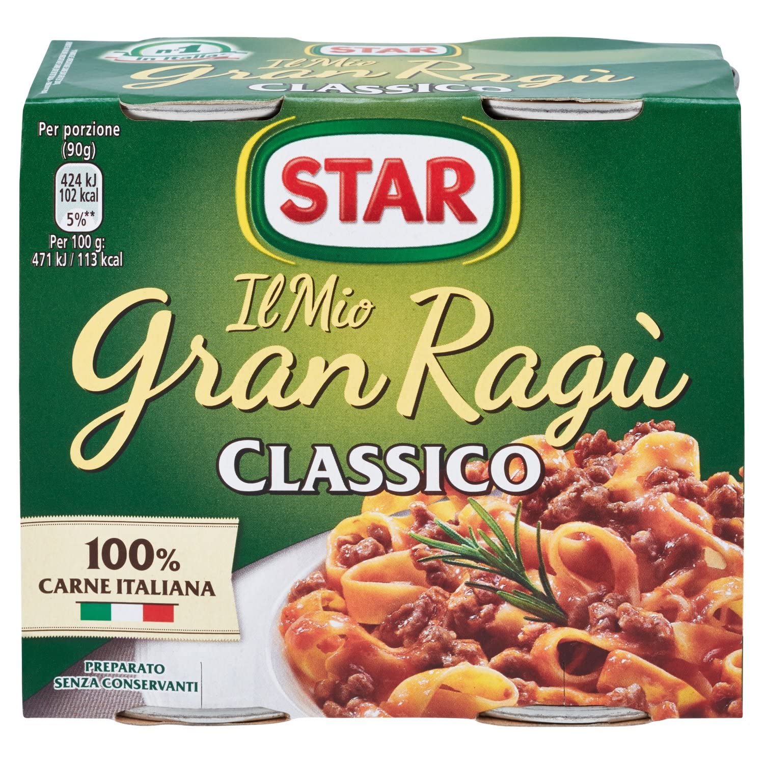 The recipe of traditional Rag par excellence, with a rich flavor and a unique taste. My GranRag½ Classico is made from 100 strictly controlled Italian meat and is guaranteed by the suppliers. Just pour it into the pot and discover that it is not a variety, but a Gran Ragí. The intense aroma and the full and meaty texture make the dish so irresistible that you can't miss it. Free from preservatives. Gluten-free. Size: 180 x 2. Ingredients: water, meat 29.5 (beef 16 , pork 13.5 ), tomato mark 15 , carrots, onions, sunflower oil 2.7 , celery, modified corn starch, salt, yeast extract, sugar, flavorings and pepper. It may contain traces: milk, fish, egg. INGREDIENTS Ingredients: water, meat 29.5 (beef 16 , pork 13.5 ), tomato mark 15 , carrots, onions, sunflower oil 2.7 , celery, modified corn starch, salt, yeast extract, sugar, flavorings and pepper. It may contain traces: milk, fish, egg.3 x Il Mio Gran Ragã Star Classico tomatensaus 2 x 180 g saus 3 x Star Tigullio GranPesto alla Genovese met basilicum 190 g sausaus Het recept van traditionele Rag par excellence, met een rijke smaak en een unieke smaak. My GranRag½ Classico wordt gemaakt van 100 streng gecontroleerd Italiaans vlees en wordt gegarandeerd door de bewaking van de leveranciers. Giet het gewoon in de pot en ontdek dat het niet om een ras, maar om een Gran Ragí gaat. Het intensieve aroma en de zo volle en vleesrijke textuur maken het gerecht zo onweerstaanbaar dat je van de schoen niet kunt missen. Vrij van conserveringsmiddelen. Glutenvrij. Formaat: 180 x 2. Ingrediënten: water, vlees 29,5 (rundvlees 16 , varken 13,5 ), tomatenmark 15 , wortelen, uien, zonnebloemolie 2,7 , selderie, gemodificeerde maïszetmeel, zout, gistextract, suiker, aroma's en peper. Het kan sporen bevatten: melk, vis, ei. INGREDIËNTEN Ingrediënten: water, vlees 29,5 (rundvlees 16 , varken 13,5 ), tomatenmark 15 , wortelen, uien, zonnebloemolie 2,7 , selderie, gemodificeerde maïszetmeel, zout, gistextract, suiker, aroma's en peper. Het kan sporen bevatten: melk, vis, ei.