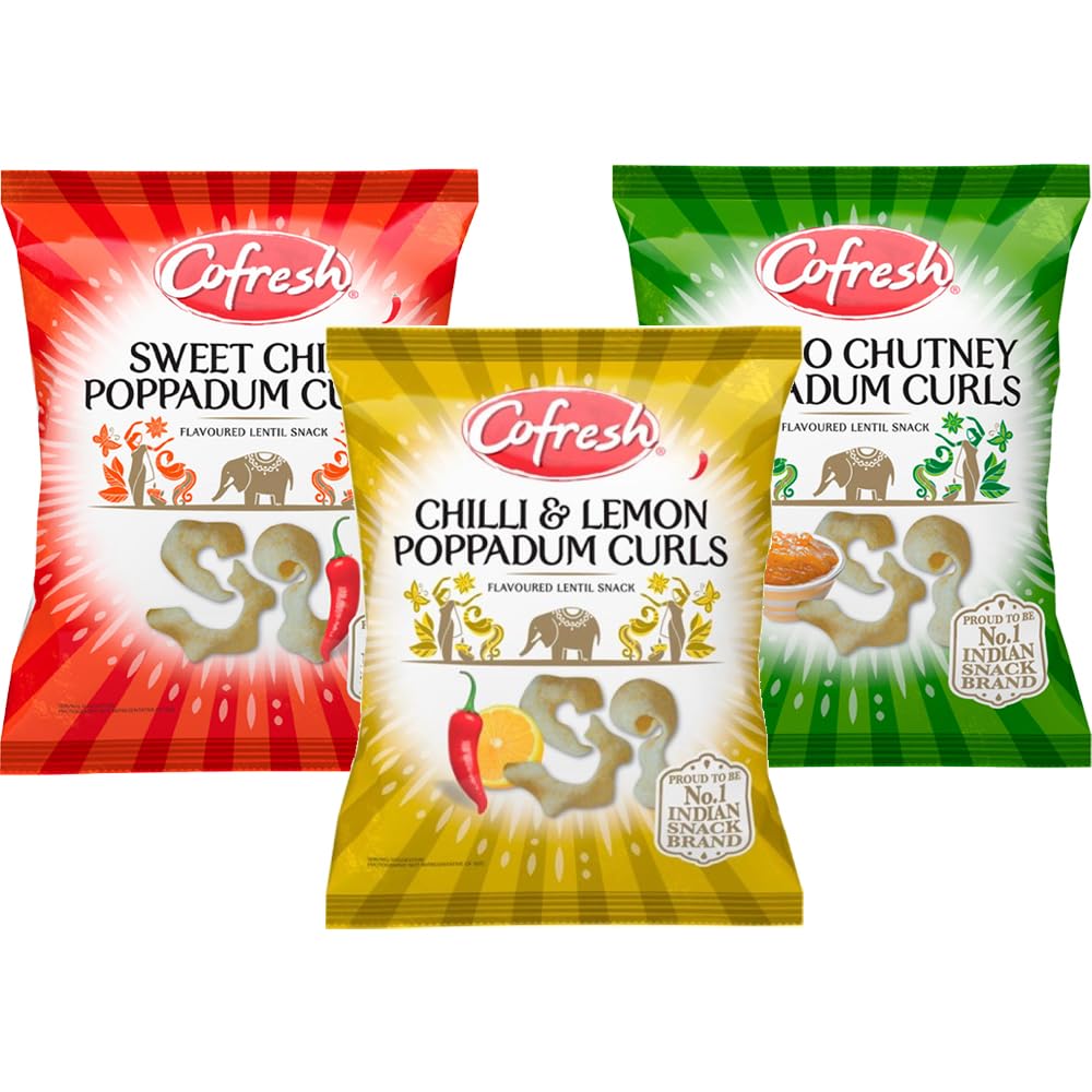 Perfect for sharing family & friends. These curls provide perfect bite sized pieces for snacking. Sweet, spicy, crispy and tangy - these Indian inspired lentil Poppadum Curls are absolutely delicious!. 1 x Mango Chutney Poppadum Curls 80g,1 x Chilli & Lemon Poppadum Curls 80g,1 x Sweet & Chilli Poppadum Curls 80g. 3 x Mixed Poppadum Curls 80g.