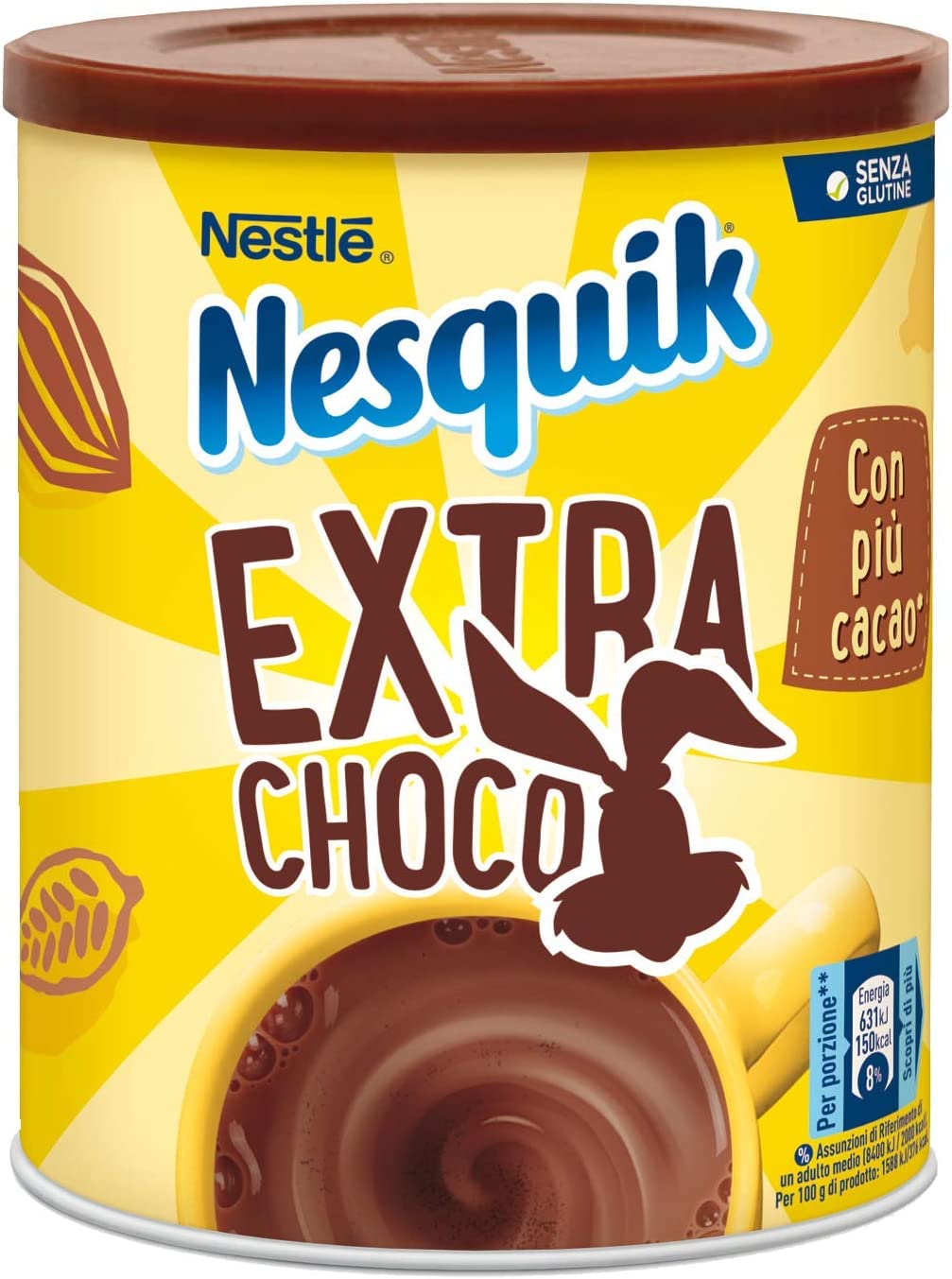 Contains approximately 24 servings, recommended dose: 16g (3 tablespoons) Nesquik Extra Choco 200ml of semi-skimmed milk. Free from artificial colors and no additives that change color. Gluten-free, suitable for people with gluten intolerance. In its elegant sheet packaging, it is ideal for those looking for an intense and decisive taste. Nesquik Extra Choco, a new formula containing 50 more cocoa than Nesquik Opti-Start, to enjoy at any time of day.Contient environ 24 portions, dose recommandée : 16 g (3 cuillères à soupe) Nesquik Extra Choco 200 ml de lait partiellement écrémé. Sans colorants, il ne contient pas d'additifs qui changent de couleur. Sans gluten, adapté aux personnes intolérantes au gluten. Dans son élégant emballage en tôle, il est idéal pour ceux qui recherchent un goût intense et décisif. Nesquik Extra choco, une nouvelle formule contenant 50 de cacao en plus que nesquik opti-start, pour profiter à tout moment de la journée.