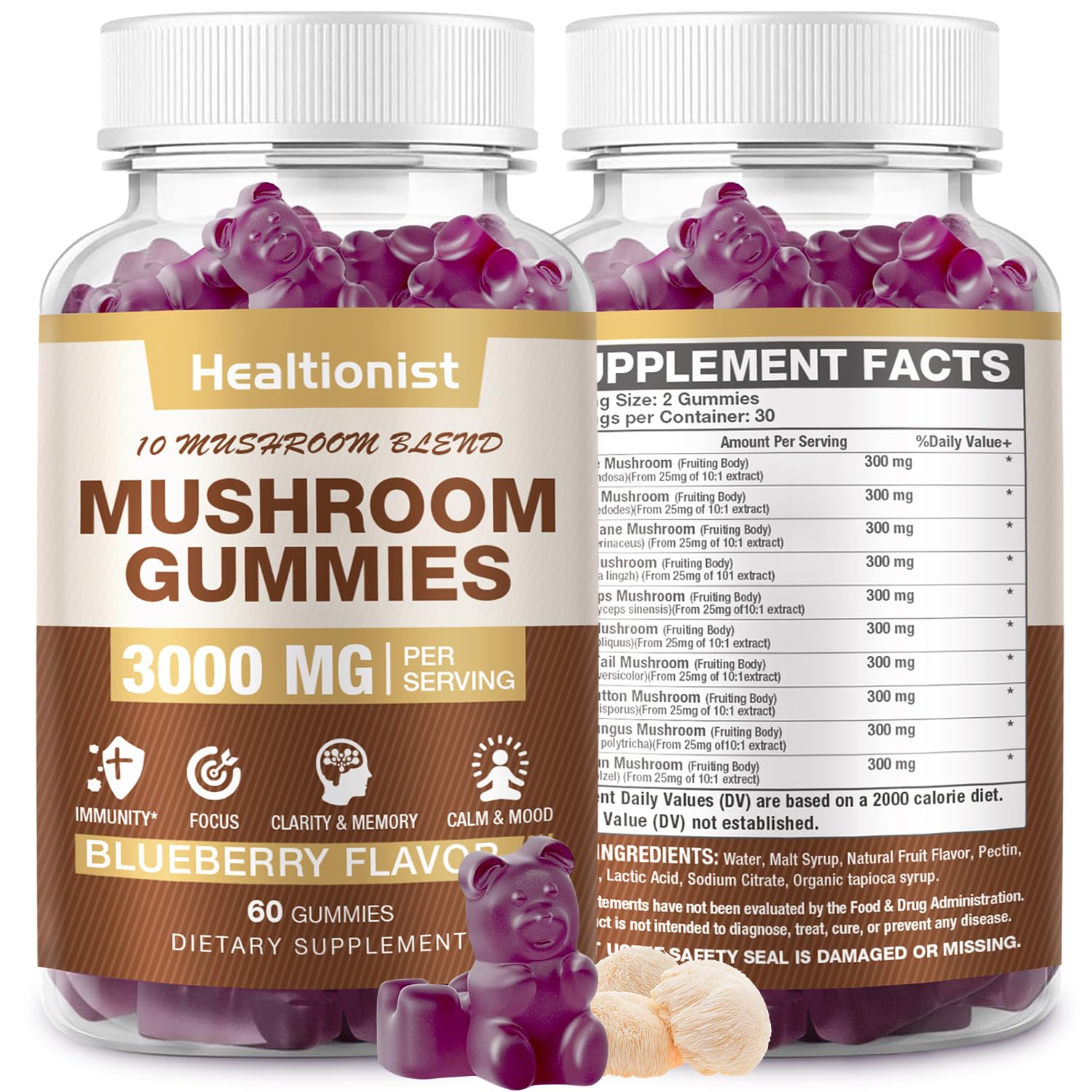 Quality Satisfaction: Each of our mushroom gummies is produced in cGMP-certified facilities with the strictest quality control standards. All batches have quality assurance at every stage of production. If you have any questions, please contact us via email and we will provide you with a 100 ideal solution. Advanced Formulation: Healtionist mushroom gummy containing 300mg Lion's Mane Mushroom, 300mg Maiitake Mushroom, 300mg Shiitake Mushroom, 300mg ReishiMushroom, 300mg Cordyceps Mushroom, 300mg Chaga Mushroom, 300mg TurkeyTail Mushroom, 300mg White button Mushroom, 300mg Black Fungus Mushroom, 300mg Royal Sun Mushroom are an easy to take gummy suitable for women, men, adults and children. They do not raise blood sugar levels and are pectin based. You can incorporate them into your daily routine without feeling guilty or affecting your dietary preferences. Mood Support Sleep — Healtionist mushroom gummies help promote relaxation, these adaptogenic mushrooms are your daily ally in managing stress and enhancing well-being. As a superfood, they provide a serene escape in each bite, supporting restful sleep and overall health. Indulge in the tranquility offered by Reishi. . Immune System — Healtionist advanced mushroom blend including Chaga, Maitake, Turkey Tail, Shitake, Reishi, and Cordyceps, as well as the added benefits of lion's mane. These mushrooms have been used for centuries in traditional medicine to support overall health and wellness. Healtionist mushroom gummies act as an effective immune defense booster to help keep your body going strong and feeling healthy through every seasonal change. Boost Your Brain — Healtionist mushroom blend gummies are designed to improve memory, focus, and mental clarity. Ideal as a daily supplement, lions Mane mushroom works as a brain support by enhancing your brain power and cordyceps mushroom in our mushroom complex gummies is the source of energy and anti-aging, contributing to your overall brain health and cognitive resilience.