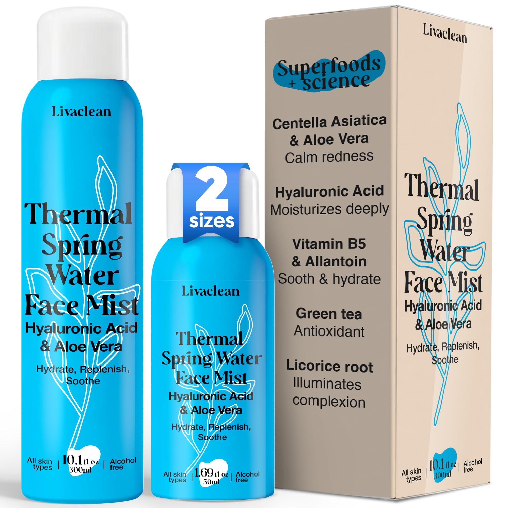 CLEAN SKIN-FRIENDLY FORMULA – Free from parabens, alcohol, and harsh chemicals. Non-comedogenic, fragrance-free, and suitable for even the most sensitive skin. MULTI-PURPOSE FACIAL MIST – Use it as a toner, makeup setting spray, post-sun refresh, or a quick skin boost throughout the day. Great for travel, post-workout, or hot weather. This hydrating face spray instantly cools and revitalizes tired skin. ? PURE NOURISHING MINERAL SPRAY – Packed with essential minerals, this thermal spring water mist strengthens the skin barrier, protects against environmental stressors, and promotes a healthy glow. SOOTHES CALMS SENSITIVE SKIN – Enriched with Aloe Vera Mineral-Rich Thermal Spring Water, this facial spray gentle formula helps reduce redness, irritation, and dryness, making it ideal for sensitive or reactive skin. HYDRATES REFRESHES SKIN – Infused with Hyaluronic Acid, this ultra-fine hyaluronic mist spray provides instant and long-lasting hydration, leaving skin plump, soft, and dewy. Perfect for daily use on all skin types.
