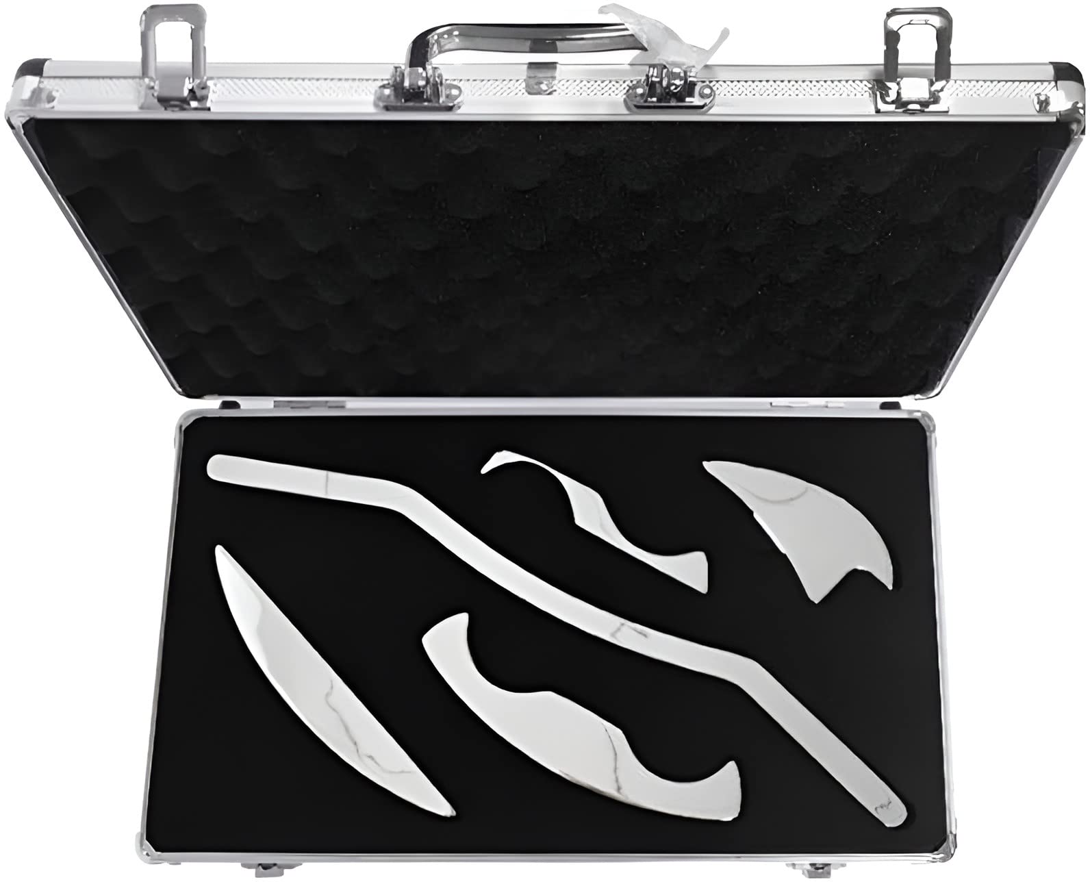 Product name: stainless steel fascia knife Gua Sha Massage Tool Material: stainless steel 304 Size: 440 x 250 x 65 mm. Weight: 1 kg. List: 5 x Gua Sha massage knife. 1 x aluminum box. Gua Sha is a traditional Chinese medical treatment in which the skin is scraped to produce light petechia.Practitioners believe that Gua Sha releases unhealthy physical substances of blood socket in wounds, tired, stiff or injured muscle areas in order to stimulate the new, oxygen -rich blood circulation to the areas and thus promote the metabolic cell repair, regeneration, healing and relaxation. This stainless steel scraping fascia knife is made of 304 stainless steel and high -gloss polished. The appearance is stylish and smooth. The set consists of 5 parts, for the treatment of muscle pain and myofascial pain. It is a good price-performance ratio GUA SHA massage tool knife set.It is a very good Gu Sha and massage tool.It is also an exquisite gift for friends and parents.5. Package: packed in aluminum box, delivery within 7–15 working days.4. Purpose: This GUA-SHA tool can increase blood flow, lymphatic and body fluids, improve the general health of your body.Whether you feel pain or not, it can be used to alleviate the fatigue of the day.3. Tool set: 5 different shapes of fascia knives for the treatment of sore muscles in different parts of the human body.2. Process: The lens is polished, smooth and round.1. Material: high-quality 304 stainless steel, a very good Schab massage tool.Produktname: Edelstahl Faszienmesser Gua Sha Massage Tool Material: Edelstahl 304 Größe: 440 x 250 x 65 mm. Gewicht: 1 kg. Liste: 5 x Gua Sha Massagemesser. 1 x Aluminiumbox. Gua Sha ist eine traditionelle chinesische medizinische Behandlung, bei der die Haut geschabt wird, um leichte Petechien zu produzieren. Praktiker glauben, dass Gua Sha ungesunde körperliche Substanzen von Blutstase in wunden, müden, steifen oder verletzten Muskelbereichen freisetzt, um die neue, sauerstoffreiche Durchblutung zu den Bereichen zu stimulieren und so die Stoffwechselzellreparatur, Regeneration, Heilung und Erholung zu fördern. Dieses Edelstahl Schabende Faszienmesser ist aus 304 Edelstahl gefertigt und hochglanzpoliert. Das Aussehen ist stilvoll und glatt. Das Set besteht aus 5 Teilen, zur Behandlung von Muskelschmerzen und myofaszialen Schmerzen. Es ist ein gutes Preis-Leistungs-Verhältnis Gua Sha Massagewerkzeug Messer-Set. Es ist ein sehr gutes Gu Sha und Massagewerkzeug. Es ist auch ein exquisites Geschenk für Freunde und Eltern.5. Paket: Verpackt in Aluminiumbox, Lieferung innerhalb von 7–15 Werktagen. 4. Zweck: Dieses Gua-Sha-Werkzeug kann den Blutfluss, Lymph- und Körperflüssigkeiten erhöhen, die allgemeine Gesundheit Ihres Körpers verbessern. Ob Sie Schmerzen fühlen oder nicht, es kann verwendet werden, um die Ermüdung des Tages zu lindern. 3. Werkzeug-Set: 5 verschiedene Formen von Faszienmessern zur Behandlung von Muskelkater in verschiedenen Teilen des menschlichen Körpers. 2. Prozess: Die Linse ist poliert, glatt und rund. 1. Material: hochwertiger 304 Edelstahl, ein sehr gutes Schab-Massagewerkzeug.304 Edelstahl Gua Sha Massage Tool 5-teiliges Set zur Behandlung von Muskelschmerzen und myofaszialen Schmerzen