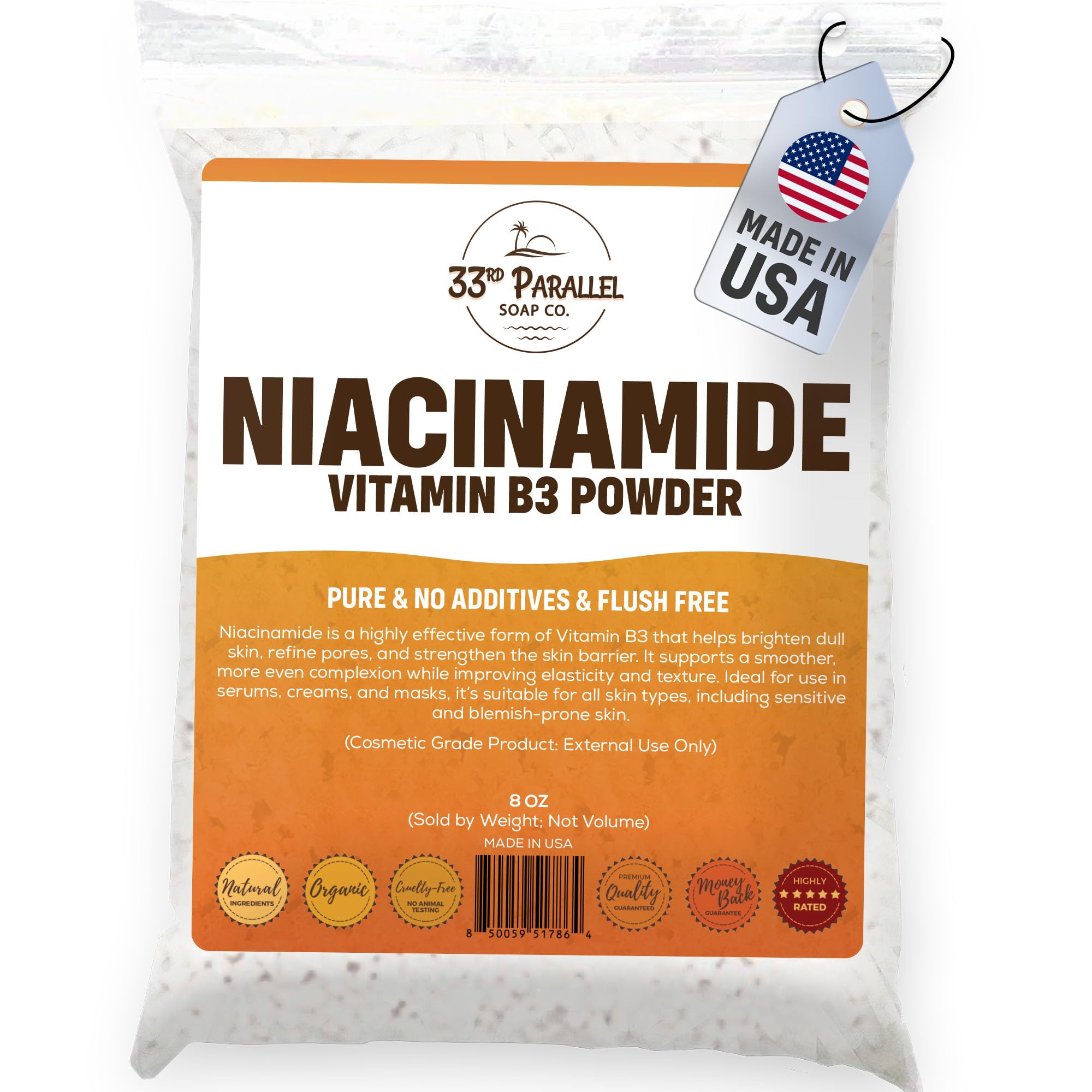 PREMIUM GRADE SATISFACTION GUARANTEED - 33rd Parallel Soap Co supplies bulk Niacinamide Powder Vitamin B3 to premium cosmetic brands and we stand behind the purity and quality of every product we sell. Enjoy our high quality RESEALABLE PACKAGING!. GENTLE, SAFE EFFECTIVE: Water-soluble, non-irritating, and suitable for all skin types—vegan, paraben-free, and ideal for clean-beauty and sensitive-skin formulations. ANTI-AGING HYDRATING BENEFITS: Supports collagen production, minimizes fine lines, strengthens the skin barrier, and helps maintain lasting hydration. VISIBLE BRIGHTENING RADIANCE: Helps reduce dark spots, discoloration, and dullness while promoting a healthy, luminous complexion. MULTI-PURPOSE SKINCARE ACTIVE: Pure Niacinamide Powder (Vitamin B3) enhances serums, creams, and toners to brighten, smooth, and even skin tone in DIY and professional skincare.