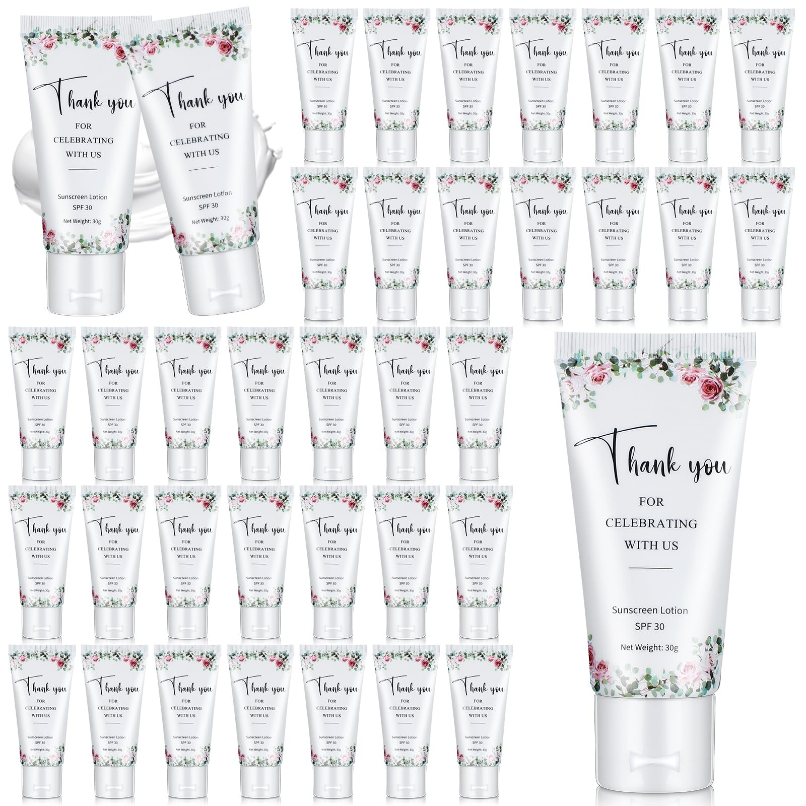 Features: Powerful sun protection factor: Travel size sunscreen is a necessity for your daily skin care. The powerful sun protection factor allows you to enjoy the sun without worrying about being damaged by UV rays. At the same time, it can also effectively resist the damage of free radicals to the skin. Keep skin fair and youthful. Ideal gift: This sunscreen has a lightweight structure and is easy to carry. It can be applied in daily life, as well as at parties, banquets and other occasions. It is also a good choice to give a copy to your friends or family to express your heart through this small gift. Specifications: Main ingredients: water, glycerin, mineral oil, palmitate, sorbitan oleate, etc. Color: white paste Size: about 4.13 x 1.81 inches 10.5 x 4.6 cm Net weight: about 1oz 30g Package includes: 36 x Wedding party sunscreen Notes: Manual measurement, please allow slight errors on size. The color may exist a slight difference due to different screen displays. Please keep it out of reach of children. Since everyone's skin is different, if you feel any discomfort, you should stop using it immediately. Our product is not suitable for sensitive skin. Test whether there is any allergy on a small part of your skin before useWide Range of Uses: wedding party sunscreen is suitable for wedding gift filling, bridesmaid gifts, baby showers and other occasions to express gratitude You can also take it to school, work, outdoor parties, etc. It is also a beautiful gift for children, spouses, mothers gifts or even as souvenirs for events such as birthday celebrations, weddings and anniversaries. How to Use: wedding sunscreen lotion applies to all skin areas 15 minutes before sun exposure, avoiding eye area For better results, reapply 80 minutes after swimming or sweating Compact and portable, it is convenient to carry and can be easily stored in pockets, wallets and handbags, and can be reapplied anytime and anywhere, greatly improving the sun protection effect. Elegant Theme Design: our bridal shower sunscreen bulk uses wedding plant spring and summer leaf patterns, and is accompanied by the text "thank you for celebrating with us" to create a pleasant feeling and give the product a sense of holiness, which is more in line with the theme of weddings and gift giving, and enhances the party atmosphere, it can express gratitude to visitors more accurately. Reliable and Quality: this wedding sunscreen is specially designed to apply quickly and streak free on all skin tones Our sunscreen key ingredients are water, glycerin, mineral oil, palmitate, sorbitan oleate, etc., non greasy, a fast absorbing daily sunscreen that helps prevent and temporarily protect skin in the sun Note: Please moisturize before applying sunscreen, it will be more even and easy to apply. Package Contents: you will receive 36 packs of wedding party mini sunscreen, 1 oz travel size sunscreen lotion, sunscreen cream measures approximately 4.13 x 1.81 inches 10.5 x 4.6 cm, plenty of quantity, ideal for gifting choice.