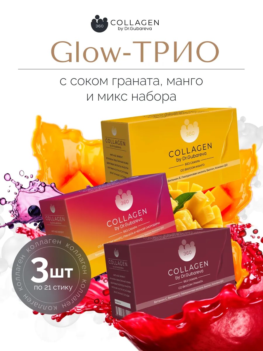 360 Collagen by Dr. Gubareva Набор пептидного коллагена желе в стиках с соком граната, манго и микса вкусов 360 by dr. Gubareva