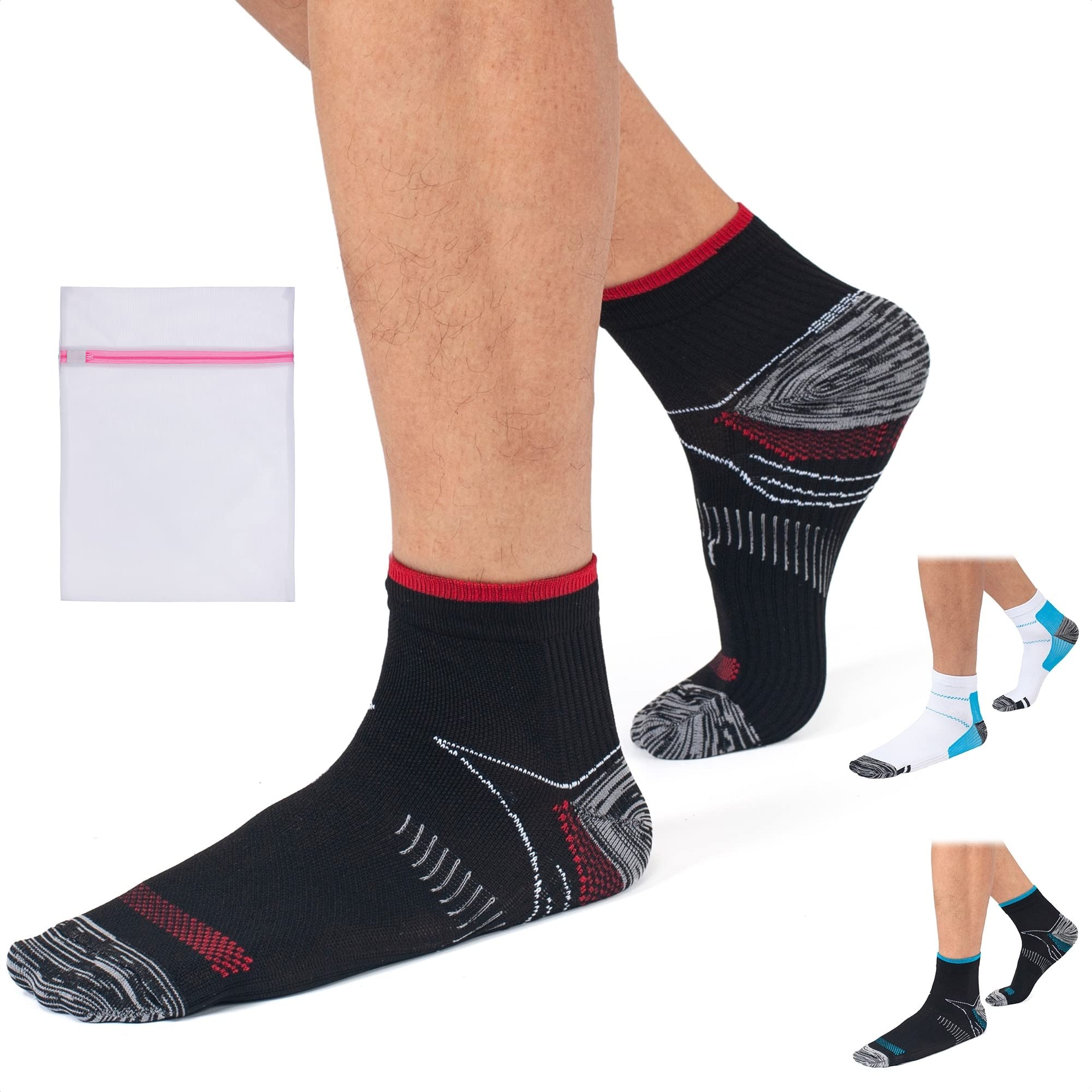 If the ordered size does not fit, please let us know. Our aim is to get it right for you. BREATHABLE LIGHTWEIGHT MATERIAL: Our compression socks are made from premium quality, lightweight, breathable, long-lasting, sweat absorbent and anti-slip material that can be worn just like normal socks and are suitable all year round. Supplied: 1 Pair Compression Ankle Socks comes with 1X Mesh laundry bag. Machine-washable in lukewarm water on gentle cycle or hand-wash. Do not tumble dry, hang dry only. Do not use bleach. Do not dry clean. ULTIMATE PERFORMANCE: Special Knitted Technical Design, fits every ankle shape and provides the ultimate support and stability in all the right places. Our high elastic ankle compression socks will fit you tightly and comfortably, improving circulation and maintaining your peak performance. PROVIDES MULTI ZONE COMPRESSION: Compression is proven to improve healthy blood flow, and oxygen flow preventing cramping, fatigue, swelling and helps in muscle recovery. Our Multi Zone compression design, provides extra support to the ankle, heel and Arch. SUITABLE FOR TRAVELLING, PREGNANCY ACTIVE LIFESTYLE: Our compression running socks are preferred by trainers. Designed for everyday use, they can help with your performance for any sport activity such as yoga, gym, cycling, running, walking, standing all day, travel, or just sitting on the couch. 360 PROTECTION FOR YOUR FEET: Our Ankle Compression socks, can help relieve pain caused by Planter Fasciitis, Achilles, Tendonitis, Flat feet, Burning Nerve pain, Arch pain, Arthritis, Heel pain and also helps with swelling.