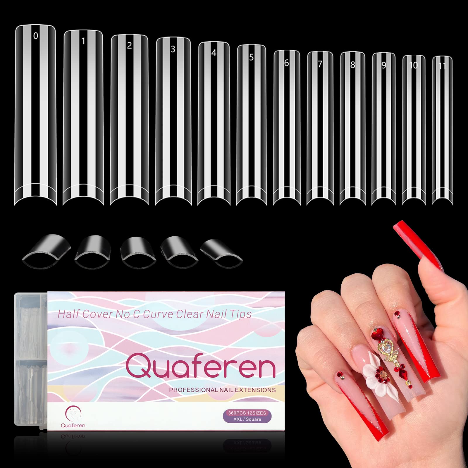Feature: 1.12 sizes, pre-numbered, each size contains 30pcs: 360PCS Clear natural nail extension tips, including 12 sizes for you to choose, usually suitable for most finger sizes. Packed in a white box, it is very convenient to carry, store and organize according to the size of the nail. 2. Easy And Convenient Operation: XXL long square nail tips no c curve are very popular in professional nail salons and are very suitable for manicurists. 3. Easy To Polish And Remove: The nail polish or nail get goes on smoothly with our nail tipe faces since it not rough.These nail tips hold the nail polish and the get sturdily and stably. Our natural square no c curve nail tips are also easy to remove/dissolve,which just takes 5-10 mins to finish. You can use the acetone polish so they don’t ruin my natural nails, Wearing this aritifical fake nail tips will not effect you doing the offical work,housework or the garden work.?Show Unique Charm?: Clear extra long false nail tips are great for nails salon and DIY home nails art. Perfect to be used on wedding, prom, dating. Also suitable for Halloween, Christmas, Valentine's Day and other festival party. Wonderful gift for girlfriend, family and friends. Extra long size nail style is very eye-catching, can help you become the shining focus in the crowd!. ?Easy To Use & Come With Box?: 12 different sizes, pre-numbered 0-11, you can easily select the appropriate size, trim the shape and length according to your needs. After fitting a suitable nail tip, apply glue or nail art monomer on the edge of the false nail, stick it on your nail and press for 10 seconds, and then irradiate it with a nail lamp for one minute. After fixing, you can start shaping your favorite nail styles!. ?Safe & Long-lasting & Durable?: Using high-quality ABS material, not soft and flimsy, not easy to crack, very sturdy. Non-toxic and odorless, harmless to your nails, providing you with a safe and comfortable manicure experience! XXL square half cover clear nail tips for acrylic nails are elegant in shape. The number of 360 pcs is very suitable for nail salons, nail tech and nail art beginners!. ?XXL Extra Long Nail Tips?: New flattened square nail tips no c curve are easy to shape, you can make many different types of false nails by trimming and polishing, like xxl coffin ballerina nails, long french nails, long stiletto false nails, middle length ballerina tips. The longest size is 2.24inch in length for size 0 and shortest lenght 1.88inch for size 9. It's much longer than other nail tips on the market. Very suitable for girls who follow the fashion trend of super long nails!. ?Upgraded No C Curve Design?: Tapered square nail tips is the latest upgrade, its curvature is not so deep, the lines are flatter, it is better to fit your nail bed, won't pop up, this allows you to wear it for a longer period of time, up to 2-3 weeks! C curve nail tips are too curved and too thick to stick to natural nails. Our tapered square nail tips are easy to shape and can stick to the nail naturally, saving a lot of time for shaping and gluing!.Best Sellers Rank: See Top 100 in Beauty & Personal Care. Style: stiletto. Brand: Quaferen. Material: Acrylic. Size: 360 Piece Assortment. Color: 360PCS XXXL Square With Box. : B09PV32MPM. Manufacturer: Quaferen. Product Dimensions: 7.91 x 4.72 x 1.18 inches; 8.78 Ounces.