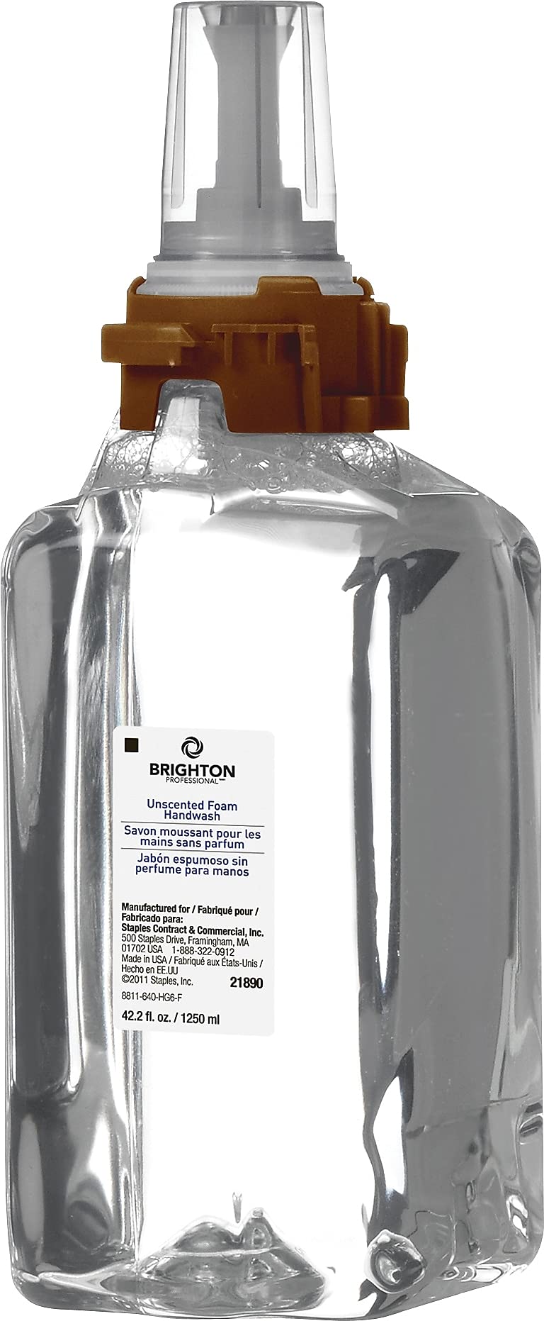 Brighton Professional Foaming Soap kills harmful germs and leaves your hands feeling fresh. Create a healthy office environment with Brighton Professional ADX Clear Gentle Fragrance Free Hand Wash. This germ-killing hand wash sanitizes your hands in one scrub without leaving behind an offensive synthetic fragrance. Gentle foaming hand wash soap for use with dispensers. 42.2 oz. per refill bottle. Three refills per pack. Unscented soap for sensitive users. Non-refillable container maintains hygiene. Enriched with moisturizers, natural extracts, and skin conditioners for a gentle handwashing experience. Removable pump allows for easier recycling. USDA certified bio-based formulation. EcoLogo certified for minimal environmental impact. Brighton Professional ADX Clear Gentle Hand Wash is unscented, making it ideal for sensitive users or those with allergies to strong perfumes. Use this hand wash as an alternative to scented hand wash in your office restrooms. Enriched with moisturizers. Brighton Professional ADX Clear Gentle Foaming Hand Wash is enriched with moisturizers and skin conditioners that won't dry out your skin after washing, leaving your hands feeling soft even after vigorous scrubbing. This fragrance-free soap is also gentle enough for people with sensitive skin susceptible to allergic reactions. Fits Most Brighton Professional Dispensers Brighton Professional ADX Clear Gentle Foaming Hand Wash fits Brighton Professional 371982, 400105 and 455626 dispensers so you get the optimized amount of soap with every push and reduce waste. These packs are non-refillable, leaving no risk of contamination by using refilled soap.