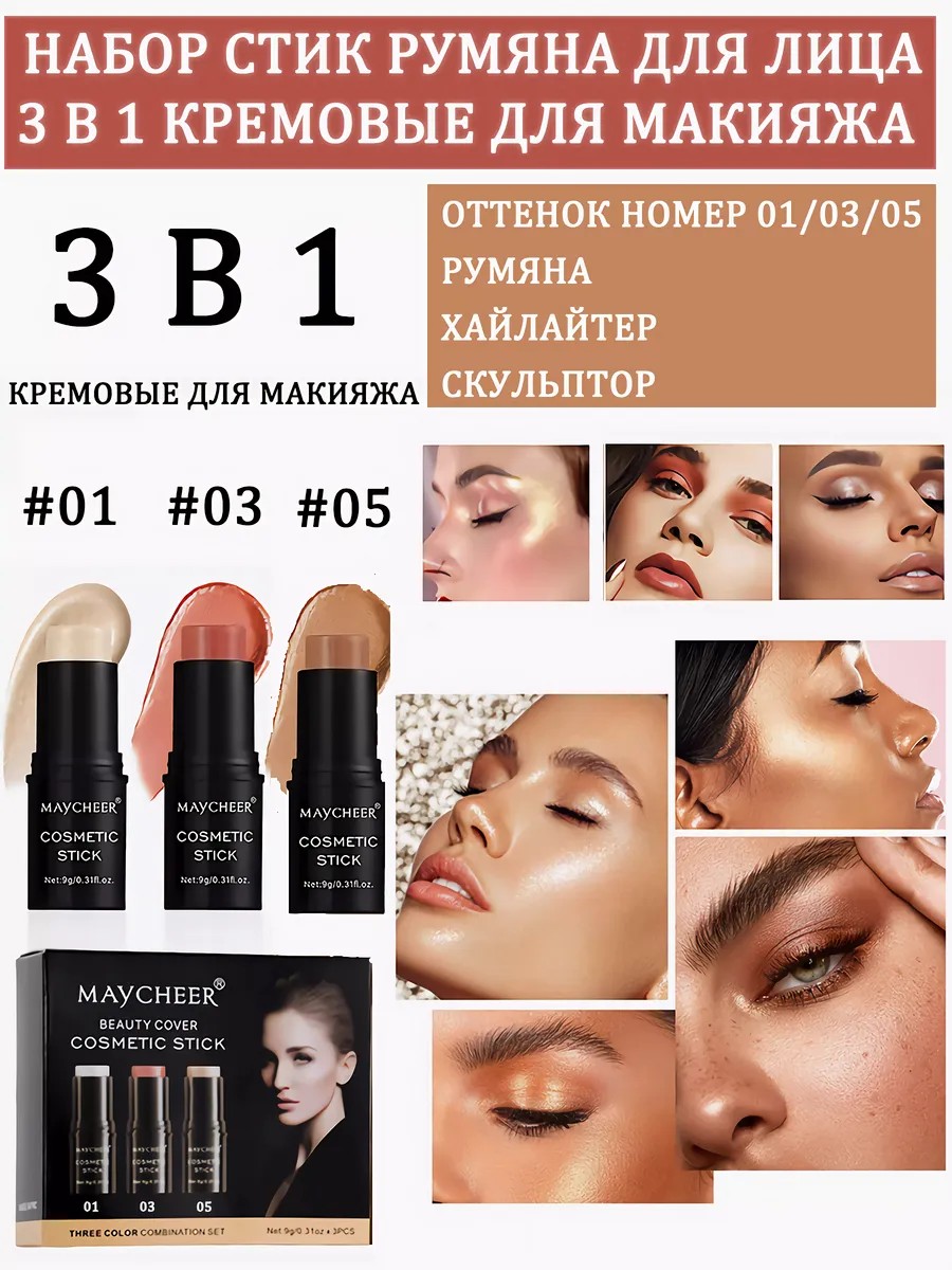 Идеальный набор для женщин и девушек Стики для макияжа Maycheer - хайлайтер, контуринг, румяна, в формате толстого карандаша 3 в 1 для лица, для губ, для щек, для глаз. Стик-румяна - это многофункциональный продукт для контуринга и скульптурирования лица одним движением придаст коже свежий и сияющий вид. Нежная текстура румян для макияжа равномерно распределяется, быстро фиксируется на поверхности лица, поддается растушевке, что позволяет добиться максимально естественного финиша. Светоотражающие микрочастицы жидких румян придают эффект здоровой упругой кожи. Кремовые румяна стик для лица очень удобны, можно использовать не только для щек, но и для век, и для губ. Кремовые румяна в стике объединяют в себе несколько средств, что делает их по-настоящему универсальными. Румяна можно использовать как помаду, как тени для век кремовые и как румяна. Способ применения: нанесите румяна на необходимые участки, можно растушевать кистью-дуофиброй, спонжем, для более тонкого эффекта - пальцами.