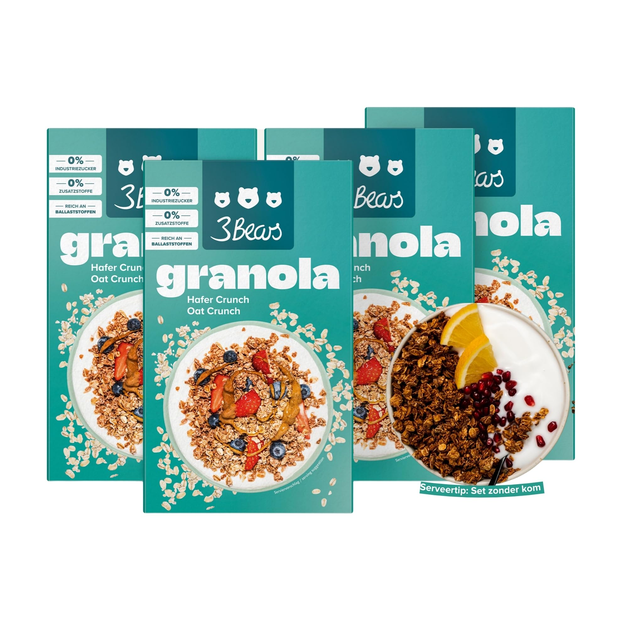 Discover 3Bears Coconut Cinnamon Granola, the world's best nutty crunchy granola, developed in collaboration with popular influencer Sarah Harrison. Our granola tastes like you baked it yourself - crunchy, delicious and without added sugar. Our premium recipe contains carefully selected ingredients such as whole grain rolled oats, grated coconut, puffed quinoa and amaranth, date juice, cinnamon and a pinch of sea salt. We therefore offer the world's best sugar-free granola to enrich your breakfast table. With 3Bears Granola you have countless options. Enjoy it in the morning as a crunchy muesli with yogurt, milk or plant-based drinks for a delicious granola breakfast without sugar. Or use it as a tasty snack. You can also use it as a topping for porridge, smoothie bowls or acai bowls for an extra dose of crunch. And if you're feeling creative, try our granola baking recipes to add a unique touch to cookies, granola bars or yogurt parfaits. 3Bears Granola is not only tasty, but also 100 vegan and sugar-free. We are proud to offer a tasty breakfast developed in collaboration with Sarah Harrison. Get your crunchy granola today and start your day with a treat! Buy and enjoy the world's best granola now. INGREDIENTS 59 whole grain oat flakes, 18 date juice concentrate, 7 roasted almonds, sunflower oil, 4 roasted hazelnut kernels, 2.5 puffed quinoa, 1.2 puffed amaranth, grated coconut, cinnamon, sea salt.3Bears Granola - Oat Crunch Crunchy veganistische granola met kokosvlokken en kaneel, 4x325g Zonder industriële suiker In samenwerking met Sarah Harrison Kokosnoot kaneel Ontdek 3Bears Coconut Cinnamon Granola, 's werelds beste nootachtige crunchy granola, ontwikkeld in samenwerking met populaire influencer Sarah Harrison. Onze granola smaakt alsof je het zelf hebt gebakken - knapperig, heerlijk en zonder toegevoegde suikers. Ons premium recept bevat zorgvuldig geselecteerde ingrediënten zoals volkoren rolhaver, geraspte kokos, gepofte quinoa en amarant, dadelsap, kaneel en een snufje zeezout. We bieden daarom 's werelds beste suikervrije granola om je ontbijttafel te verrijken. Met 3Bears Granola heb je talloze opties. Geniet er 's ochtends van als knapperige muesli met yoghurt, melk of plantaardige dranken voor een heerlijk granola ontbijt zonder suiker. Of gebruik het als een lekker tussendoortje. Je kunt het ook gebruiken als topping voor pap, smoothie bowls of acai bowls voor een extra dosis crunch. En als je je creatief voelt, probeer dan onze bakrecepten met granola om een unieke touch toe te voegen aan koekjes, mueslirepen of yoghurtparfaits. 3Bears Granola is niet alleen lekker, maar ook 100 veganistisch en suikervrij. We zijn er trots op dat we een smakelijk ontbijt kunnen aanbieden dat is ontwikkeld in samenwerking met Sarah Harrison. Haal vandaag nog je crunchy granola in huis en begin je dag met een traktatie! Koop en geniet nu van 's werelds beste granola. INGREDIËNTEN 59 volkoren havervlokken, 18 dadelsapconcentraat, 7 geroosterde amandelen, zonnebloemolie, 4 geroosterde hazelnootpitten, 2,5 gepofte quinoa, 1,2 gepofte amarant, geraspte kokos, kaneel, zeezout.