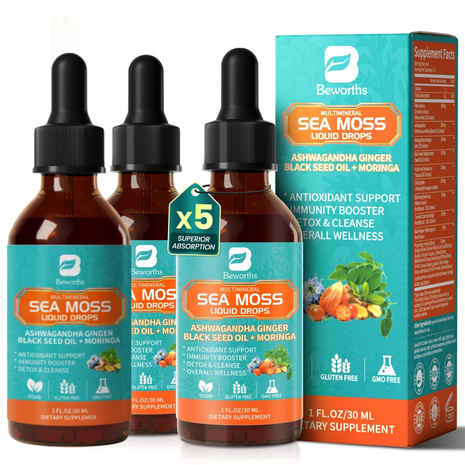 Sea Moss and Chlorophyll formula --- Organic sea moss gel rich in 92 essential minerals to boost immunity, and promote thyroid health—liquid Sea Moss Chlorophyll drops is a natural detoxifier that supports digestion and promotes skin clarity. Boost your daily wellness routine with our potent Seamoss and Liquid Chlorophyll blend with manuka honey—a powerful fusion designed to support health. Easy-to-Take Faster Absorption ---- Sea Moss Drops liquid chlorophyll blend seamlessly into water, tea, smoothies, or juice with a mild, natural flavor. Perfect for adults and kids(14 ), these alcohol-free sea moss drops ensure effortless nutrient. Just wild-harvested Sea Moss with organic black seed oil, ashwagandha, moringa, chlorophyllin, manuka honey and bladderwrack ingredients for effective daily use. Radiant Beauty Boost --- B BEWORTHS sea moss infused with chlorophyll, turmeric, black seed oil to enhance hair, skin, and nails for a youthful, glowing appearance. Irish Sea Moss 102 marine minerals for skin elasticity to beauty and wellness support, and daily vitality for both men and women. In addition, Mullein Sea Moss Lung combine a powerful herbal fusion of Irish sea moss, mullein leaf, elderberry designed to support respiratory health, boost immunity. Try sea moss liquid drops today and nourish your way to a radiant glow!. Why Choose B BEWORTHS Seamoss Supplement? ---The Ultimate All-in-One irish sea moss chlorophyll supplement for the whole family! Whether you need Sea Moss for hair growth, black seed oil for immunity, or Ashwagandha for stress, MultiMin102 sea moss liquid drops cover it all! Vegan, gluten-free, and non-GMO, making it the smartest way to fill nutritional needs daily seamoss supplment. Superior Formula Wellness Support ---- Unlike ordinary Sea Moss gel drops, Our Irish Sea Moss liquid drops deliver nature's most potent marine and herbal nutrients, including organic sea moss black seed oil, ashwagandha, elderberry, chlorophyll, manuka honey, moringa, turmeric, and rich bladderwrack. This advanced sea moss formula provides immune, digestive support, and a chlorophyll moringa combination for powerful antioxidant. Support Energy, Liver Detox Lung Health---- Multimineral Sea moss chlorophyll liquid with Bladderwrack (iodine for thyroidsupport), Burdock Root (detox), and Mullein (lung support), These drops help cleanse toxins, improve respiratory health, and mullein drops for lungs. Irish sea moss drops with black seed oil and ashwagandha enhance immunity and stress relief, while chlorophyll and elderberry provide antioxidant power. Sea moss liquid drops formulated with Chlorophyll and promote liver detox, digestion health, increase energy and boost overall health. Ultra-Potent 15-in-1 Sea Moss Liquid Drops ---- Experience the full power of irish sea moss, chlorophyll, moringa, black seed oil, ashwagandha, bladderwrack, burdock root, elderberry, manuka honey, and turmeric in one fast-absorbing liquid formula. Sea moss chlorophyll liquid has maximum absorption! Multimineral sea moss drops deliver 102 minerals (iodine, potassium, magnesium, vitamins c e k) for immune support, thyroid balance, digestion, and detox—just 1- 2ml daily!.