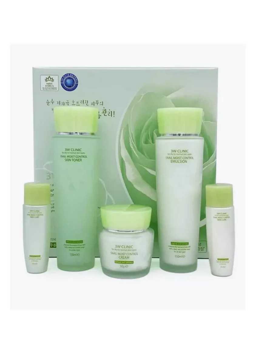 The Snail Moist Control Skin Set from 3W CLINIC contains everything you need to care for dry and normal skin.