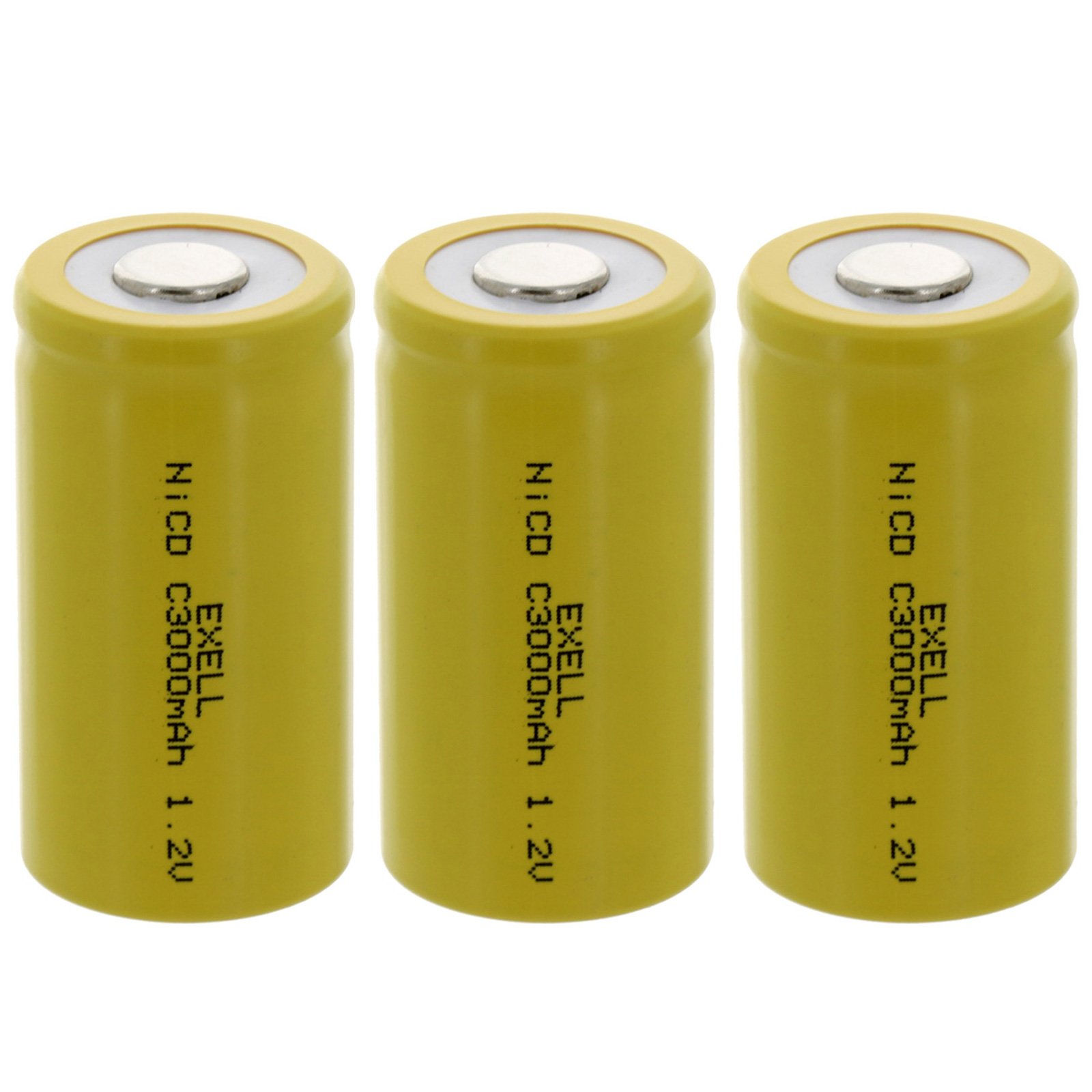 Exell C Size 1.2V 3000mAh NiCD Rechargeable Flat Top Battery Exell C Size 1.2V 3000mAh NiCD Rechargeable Flat Top Battery are excellent for building custom battery packs. If you are a novice or an old pro, these batteries will keep you powered up. These batteries can be recharged 500-1000 times giving you years of use. These high quality rechargeable Nickel Cadmium (Ni-Cd) batteries are exact Compatible Withs for standard battery in all the device. Provides ultra long use time per charge. Designed for enhanced performance for high drain applications such as digital cameras, CD players, portable audio devices, hand held games, 2-way radios, PDAs, and other portable high drain digital electronics. Can be recharged for up to 700 times, providing big saving by replacing hundreds of throw away batteries. Can be rapidly charged with any quick charger, smart chargers, plug in charger or universal chargers. Consumer Applications: Widely used in radio controlled devices, electric tools and toys, electric mopeds, meters, two radios, hybrid automobiles, electric razors, toothbrushes, cameras, camcorders, mobile phones, pagers, instruments/equipment, high power static applications (Telecoms, UPS and Smart grid), and numerous other applications. Exell C Size 1.2V 3000mAh NiCD Rechargeable Flat Top Battery Specifications Voltage: 1.2V, Amperage: 3000mAh, Chemistry: Nickel Cadium (NiCD), Height: 1.93in, Diameter: 1.00in, Terminal Types: Flat Top, NiCD Assembly Cell Battery Information Excellent quality and provide constant power electric current for your power hungry devices and some solar lights and solar applications., Low internal resistance, ideal for rapid high current discharge, Excellent battery cycle life: 1000 times, Ni-Cad battery can be charged and discharged for up to 1000 times, Environmentally Friendly (Ni-Cad can be recycled), If use once a day, Ni-Cad batteries can last up to 3 years.CROSS-REFERENCE: Before ordering this battery backup, be sure to check that the product is compatible with the battery's chemistry, size, amperage, polarity, and voltage. RECHARGEABLE BATTERY: Designed to provide long-lasting power, these tab-terminal batteries can be recharged 500 - 1000 times, giving you years of use. They'll give your high-power devices such as flashlight, radios, solar devices, and more plenty of life. HIGH-QUALITY BATTERY: Made from Nickel Cadmium (NiCD), these rechargeable batteries feature a voltage of 1.2V.They're designed for use in a wide variety of high-tech applications and are built to last. Voltage: 1.2, Amperage: 3000mAh, Chemistry: NiCAD.