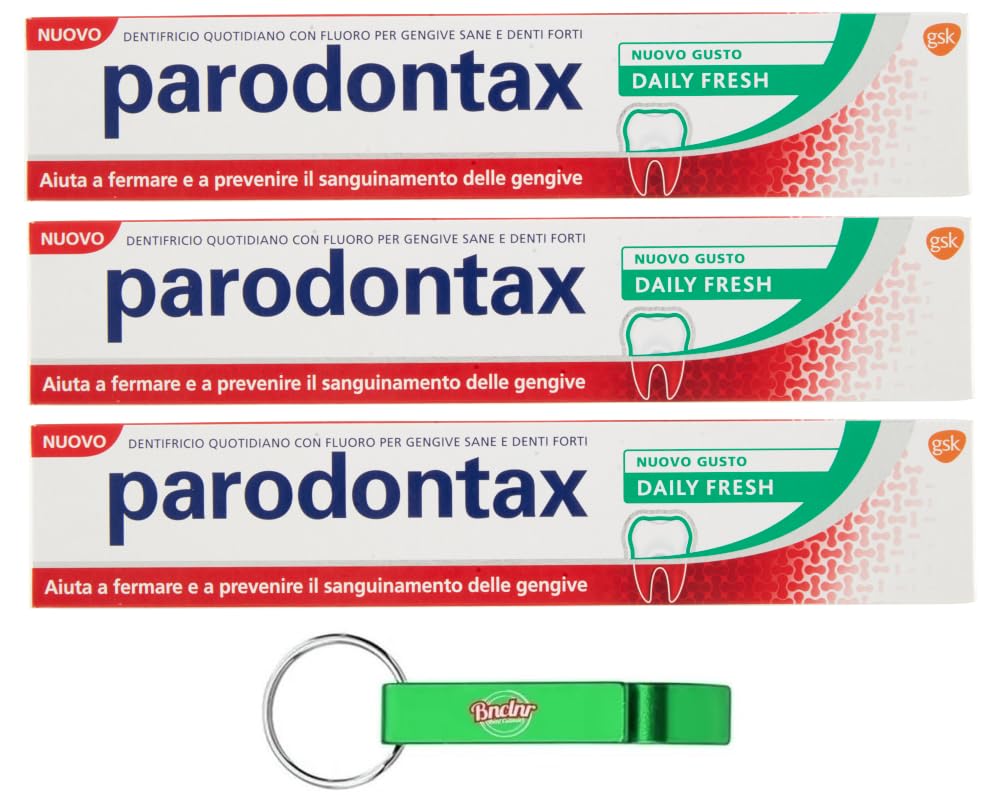 Beni Culinari Free keychain parodontax daily fresh parodontax daily fresh toothpaste removes plaque deposits, one of the causes of gum bleeding, and keeps your gums healthy and your teeth strong.It is suitable for everyday use and triggers an intensive feeling of freshness in the mouth.If you see blood when brushing your teeth or brushing your teeth, this can be a sign of gum disease.Parodontax Daily toothpaste is a special toothpaste that helps fight gum bleeding.Parodontax toothpaste contains 1400 ppm fluoride to strengthen your teeth, and sodium bicarbonate to remove plaque and keep your mouth clean.You may have to get used to the taste, but over time most people taste it and enjoy the clean feeling that he leaves.When used daily, it contributes to the preservation of a healthy gums, strong teeth and a fresh breath.to the taste may have to be used to it, but over time most people taste it and enjoy the clean feeling that he leaves.When used daily, it contributes to the preservation of a healthy gums, strong teeth and a fresh breath.Parodontax toothpaste contains 1400 ppm fluoride to strengthen your teeth, and sodium bicarbonate to remove plaque and keep your mouth clean.If you see blood when brushing your teeth or brushing your teeth, this can be a sign of gum disease.Parodontax Daily toothpaste is a special toothpaste that helps fight gum bleeding.Parodontax daaily fresh parodontax daily fresh toothpaste removes plaque deposits, one of the causes of bleeding gums, and keeps your gums healthy and your teeth strong.It is suitable for everyday use and triggers an intensive feeling of freshness in the mouth.Beni Culinari Free keychain. Beni Culinari Kostenloser Schlüsselanhänger PARODONTAX DAILY FRESH Parodontax Daily Fresh Zahnpasta entfernt Plaqueablagerungen, eine der Ursachen für Zahnfleischbluten, und hält Ihr Zahnfleisch gesund und Ihre Zähne stark. Es ist für den täglichen Gebrauch geeignet und löst ein intensives Frischegefühl im Mund aus. Wenn Sie beim Zähneputzen oder beim Zähneputzen Blut sehen, kann das ein Zeichen für eine Zahnfleischerkrankung sein. Parodontax Daily Zahnpasta ist eine spezielle Zahnpasta, die hilft, Zahnfleischbluten zu bekämpfen. parodontax Zahnpasta enthält 1400 ppm Fluorid, um Ihre Zähne zu stärken, und Natriumbicarbonat, um Plaque zu entfernen und Ihren Mund sauber zu halten. An den Geschmack muss man sich vielleicht erst gewöhnen, aber mit der Zeit schmecken die meisten Menschen daran und erfreuen sich an dem sauberen Gefühl, das er hinterlässt. Bei täglicher Anwendung trägt es zur Erhaltung eines gesunden Zahnfleisches, starker Zähne und eines frischen Atems bei.An den Geschmack muss man sich vielleicht erst gewöhnen, aber mit der Zeit schmecken die meisten Menschen daran und erfreuen sich an dem sauberen Gefühl, das er hinterlässt. Bei täglicher Anwendung trägt es zur Erhaltung eines gesunden Zahnfleisches, starker Zähne und eines frischen Atems bei. parodontax Zahnpasta enthält 1400 ppm Fluorid, um Ihre Zähne zu stärken, und Natriumbicarbonat, um Plaque zu entfernen und Ihren Mund sauber zu halten. Wenn Sie beim Zähneputzen oder beim Zähneputzen Blut sehen, kann das ein Zeichen für eine Zahnfleischerkrankung sein. Parodontax Daily Zahnpasta ist eine spezielle Zahnpasta, die hilft, Zahnfleischbluten zu bekämpfen. PARODONTAX DAILY FRESH Parodontax Daily Fresh Zahnpasta entfernt Plaqueablagerungen, eine der Ursachen für Zahnfleischbluten, und hält Ihr Zahnfleisch gesund und Ihre Zähne stark. Es ist für den täglichen Gebrauch geeignet und löst ein intensives Frischegefühl im Mund aus. Beni Culinari Kostenloser Schlüsselanhänger.3x Parodontax Dentifricio Daily Fresh,Zahnpasta für gesundes Zahnfleisch und starke Zähne,75ml + Beni Culinari Kostenloser Schlüsselanhänger