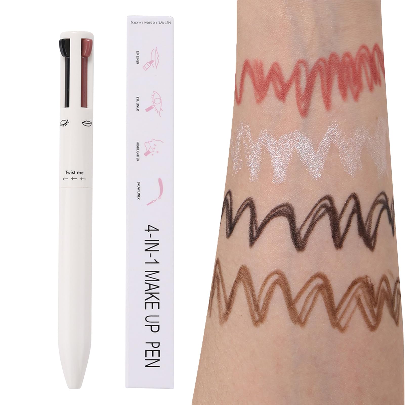 Our 4 in 1 makeup has a creamy texture that makes it easy to use, while its lightweight and compact design ensures multifunctional use. Specification: Name: 4-in-1 rotating press eyebrow pencil Product size: length 14.2cm 5.59 inches Pack List: 4 in 1 makeup 1?Keep All Day: Enjoy sweat-proof and smudge-proof eyebrow perfection with our 4 in 1 makeup pen. Its long-lasting and waterproof formula ensures your brows stay put all day, without any discoloration, smudging, or falling off – even in challenging situations. ?Travel Companion: Experience the freedom of creating your own beautiful look with our 4 in 1 makeup pen! Lightweight and compact, it easily fits into your purse or cosmetic bag, making it perfect for carrying around. Get gorgeous anytime, anywhere with ease!. ?Effortless Use: Create Perfection with Ease. The 4 in 1 makeup pen boasts a tip design that allows for ideal precision when it comes to the application of eyeliner, lip liner, brow filler, and concealer. ?High-Finish Eye Makeup: This 4 in 1 makeup pen can instantly give you a stunning eye look with its smooth, silky, and creamy texture. It has high color development and is easy to apply and blend. No need to carry multiple products, just a single pen for all your eye makeup needs. ?Multipurpose Use: Transform your look with ease using this versatile 4 in 1 makeup pen. Featuring eyebrow drawing, eyeliner, lip line, and facial contour brightening capabilities, this tool makes creating eye-catching makeup quick and simple.