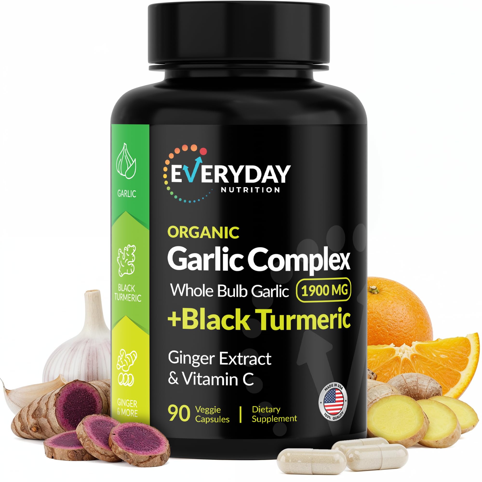 Pure and Trusted Quality – Made in the USA in a cGMP-certified facility, this supplement is vegan, non-GMO, and free from gluten, soy, dairy, eggs, nuts, preservatives, and artificial binders, offering a clean choice for your daily wellness routine. Supports Immunity, Digestion, and Joint Health – Formulated with antioxidant-rich botanicals to support immune health, aid healthy digestion, and help maintain joint flexibility and overall wellness. Naturally Potent Ingredients – Made with whole bulb organic garlic and rare Curcuma caesia (black turmeric) to deliver a full spectrum of natural plant compounds that support overall wellness. Higher Potency Than Standard Blends – Each serving delivers 600 mg of organic garlic, 500 mg of black turmeric, 300 mg of ginger root extract, and 500 mg of vitamin C to help support overall wellness, antioxidant protection, and daily vitality. 4-in-1 Premium Wellness Formula – Combines organic whole bulb garlic, rare black turmeric, concentrated ginger extract, and vitamin C in vegan capsules to support overall wellness, immune health, and daily vitality.